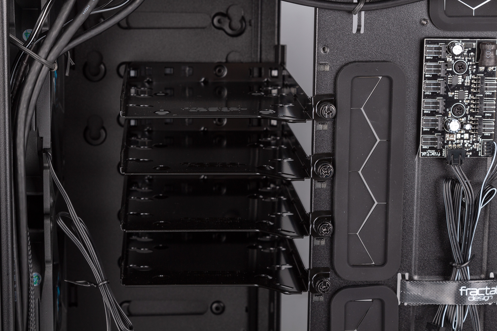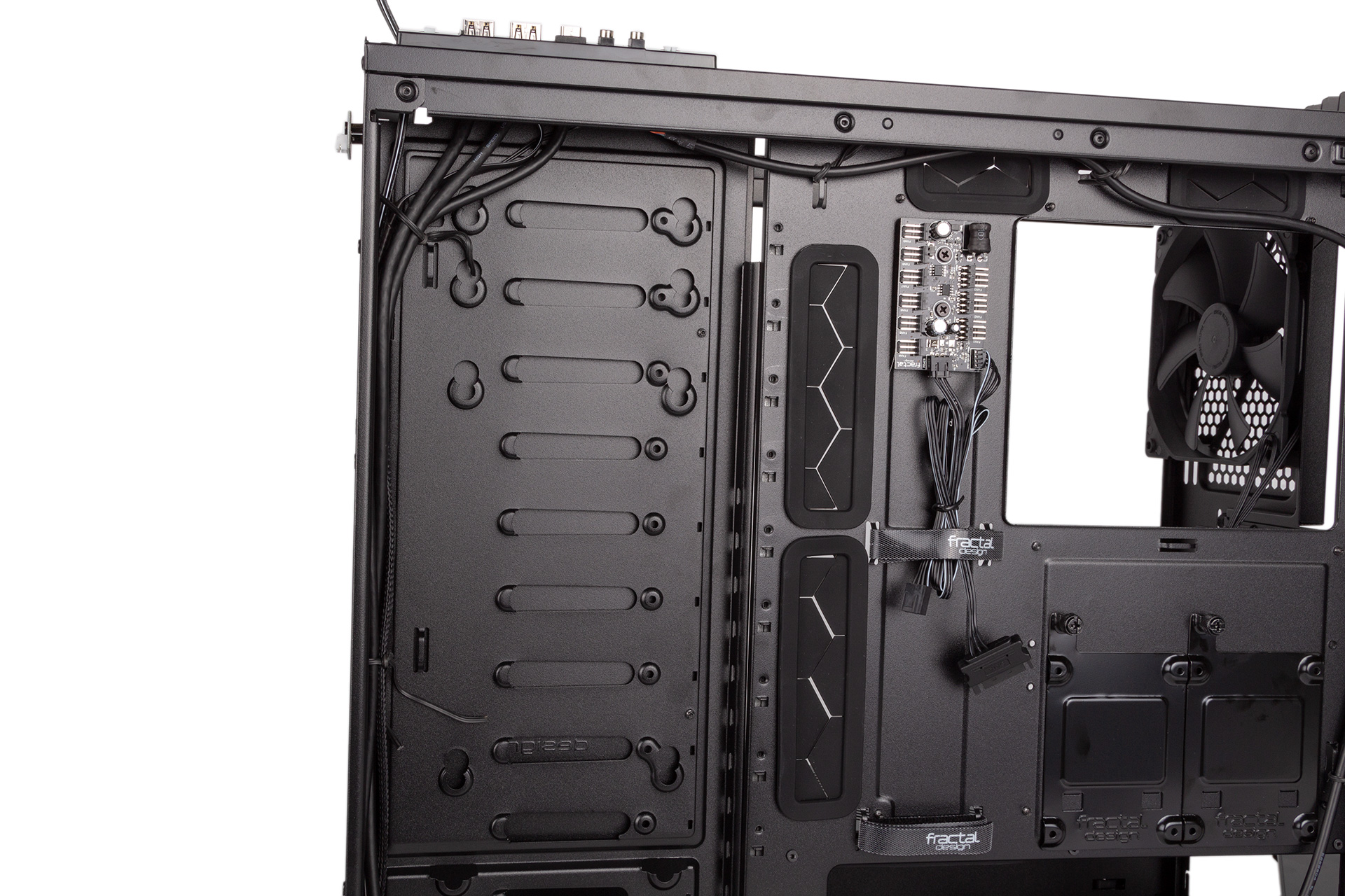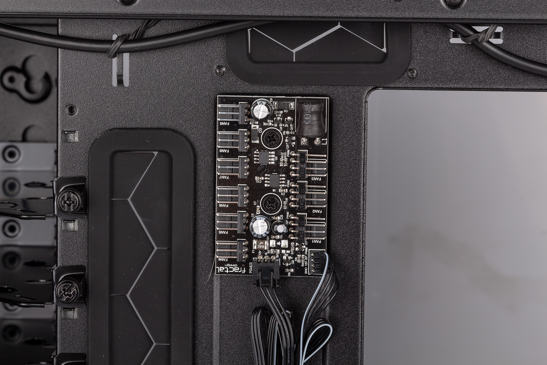 The chassis also comes with the Nexus+ fan hub, allowing you to power up to nine fans at once, although only three of the headers are the four-pin PWM variety. You can connect the hub to your CPU fan header so that its PWM signal can also control these fans. It’s also SATA-powered, which we always like to see, as Molex is less slimline and fussier to use. Fractal does not deliver the case with the fans pre-connected, although given that switching layouts involves removing the front fans, we don’t think this is a bad thing.