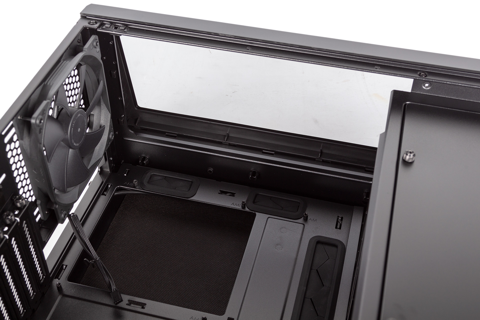 Both side panels use a rounded front hinge and an awesome push-to-lack latching mechanism that makes accessing either side very simple. The lock is strong enough that you don’t need thumbscrews, but you do get some that can be used to secure the panel when moving the case around, for example. We’re less impressed by the front panel, however, as it requires a lot of force to be used to get it back on. Note also that the steel side panel has noise-dampening material applied to it, but this isn’t used elsewhere in the case.