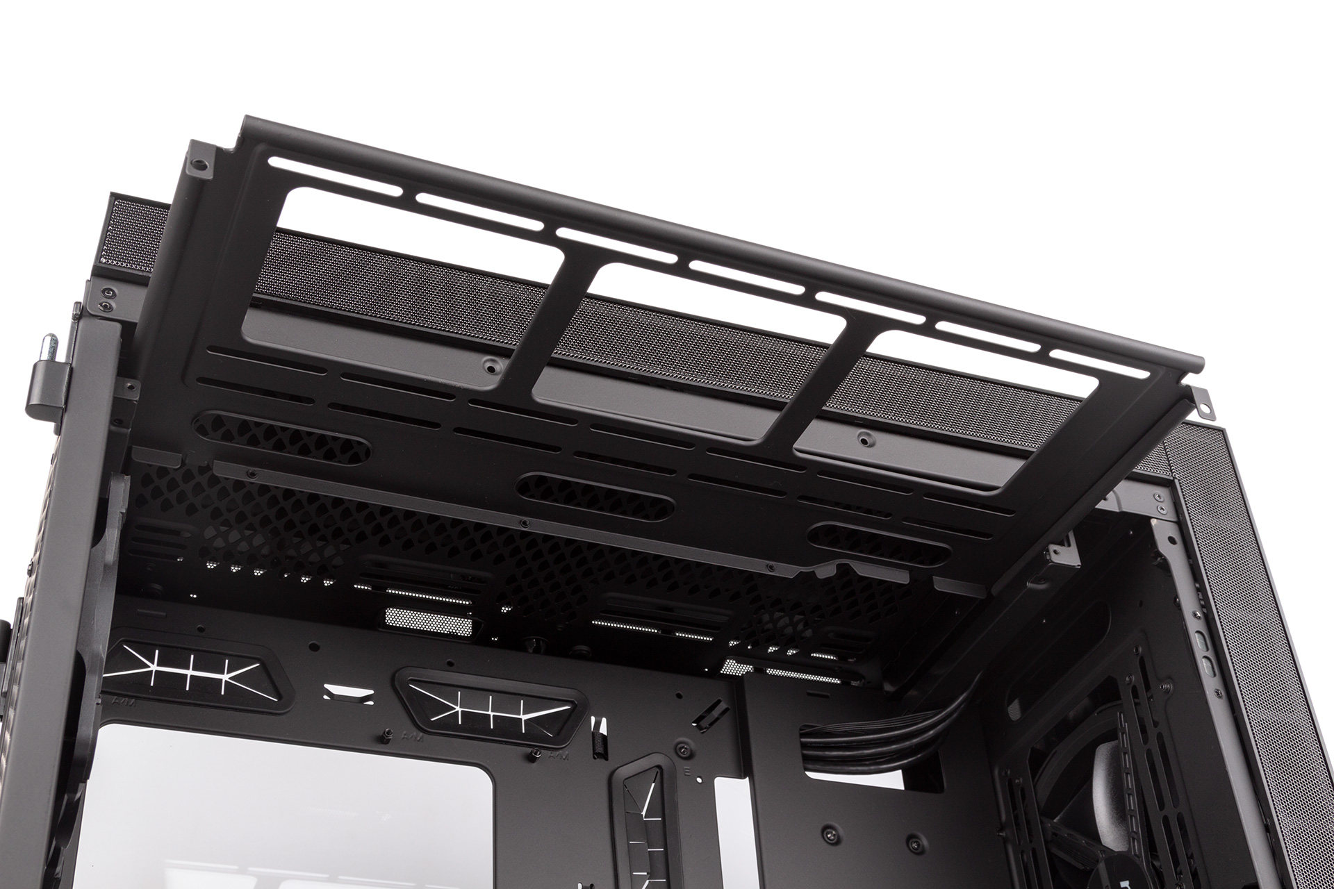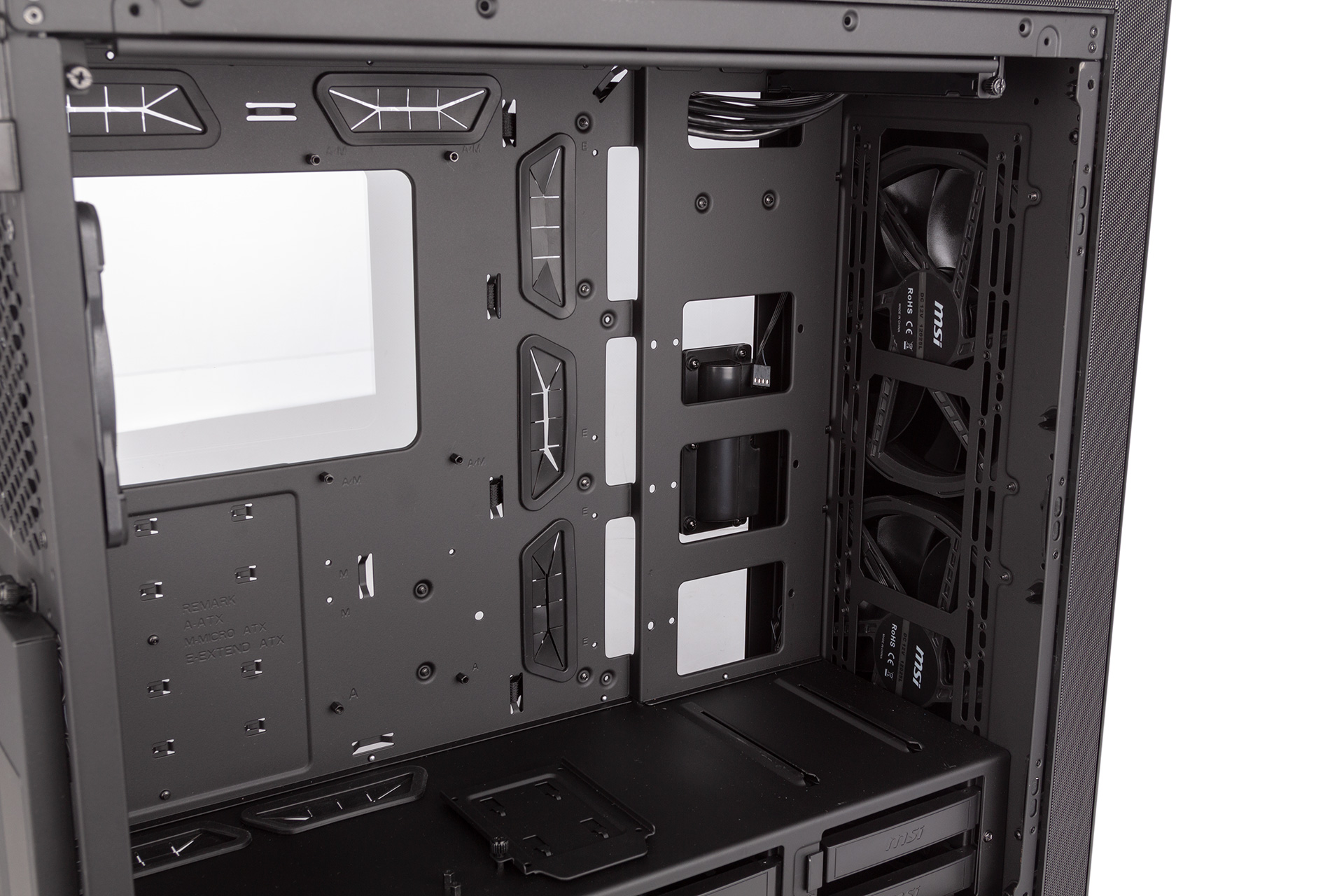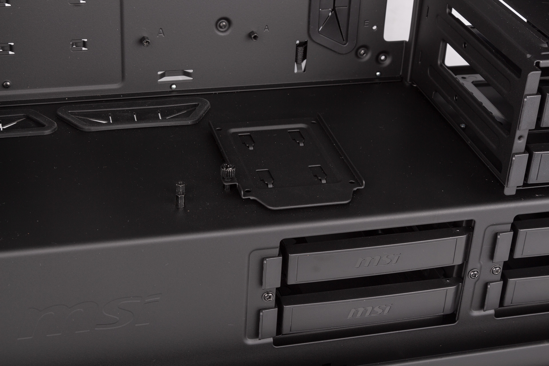 Sadly, there’s no cutout in the PSU shroud, which means MSI has been unable to take advantage of the full height of the case for water-cooling. That means you’re limited to 280mm or 240mm radiators in the front position.The roof, at least, does have support for 360mm radiators (as well as 280mm), and MSI uses a removable bracket to achieve this. The design of this is hard to fault, as it’s super easy to unscrew and slide out along its rails. Working in this area can be fiddly even in a large case, so we commend MSI for including this feature - it's just a shame something similar isn't found up front.