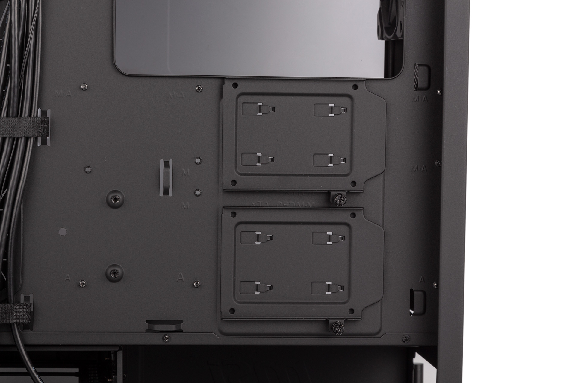 Not content with six drive positions, MSI also includes three dedicated 2.5” mounting trays, one on top of the PSU shroud and two secured behind the motherboard tray. These are sturdy and made of metal, and each is held in with a single thumbscrew, though sadly this isn’t captive. Regardless, you clearly shouldn’t struggle to fit copious amounts of storage into this case.