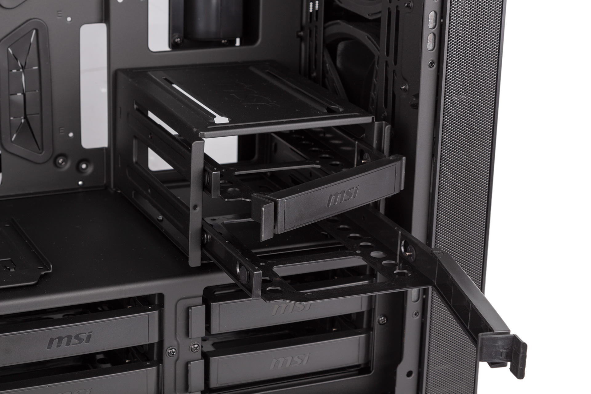 While MSI has used a standard tower layout with a PSU shroud dividing the case into two main compartments, it breaks from the norm by having the 3.5” drives accessible from the same side as the motherboard and GPU. You may prefer this, but we’d argue that it isn’t especially beneficial, as you still need access on the other side to plug drives back in unless you leave yourself plenty of cable slack, which often isn’t possible when running multiple drives. 2.5” devices are also supported (using screws) on each of the plastic trays; we’d prefer if these were metal or at least a little less flimsy, but they do function fine and have little bits of rubber surrounding the tool-free mounting pins for larger drives.