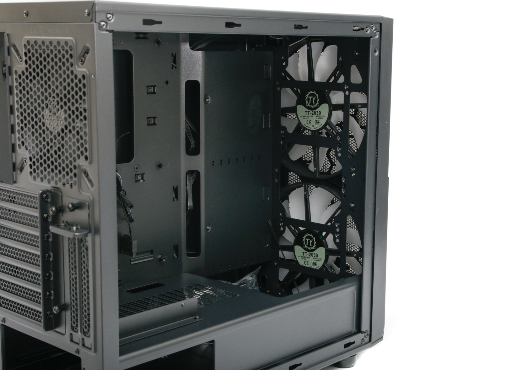 Cable tidying is reasonable, although there are no rubber grommets and precious few cable ties in the box as well - it's just as well the fans cut down on the number of cables. Round the back the PCI expansion slots make a slight nuisance of themselves, donning steel plates that screw down onto expansion card brackets. These remind us of bargain basement cases, and we're honestly not sure what they're doing here.