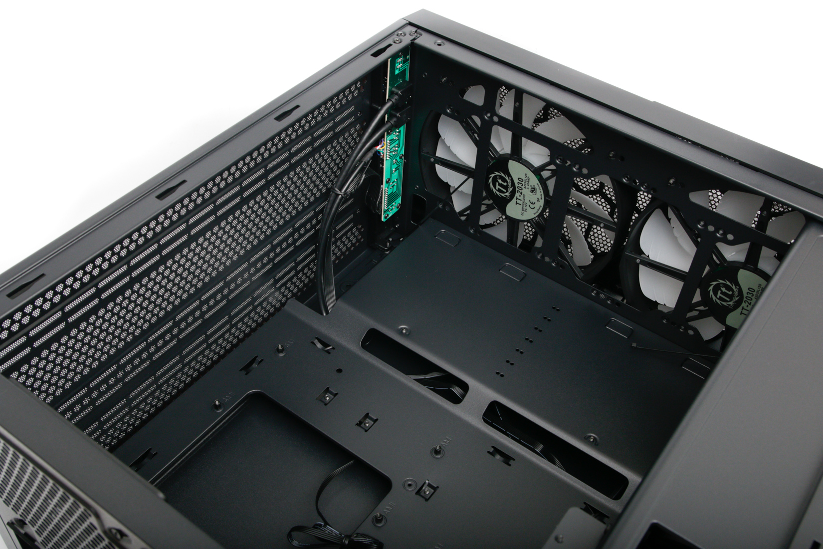 Either the roof or front section are viable options for radiators; AIO liquid-coolers are most likely to find their way into the former, where you'll benefit from elongated fan mounts that run the entire length of the panel. The enormous front fans mean that pretty much every area inside the case is going to be actively cooled to one degree or another, but likely with less airflow directed at your GPU than you'd see with a more concentrated 120mm or 140mm fan. Again the copious mesh will definitely help with getting air into the case.