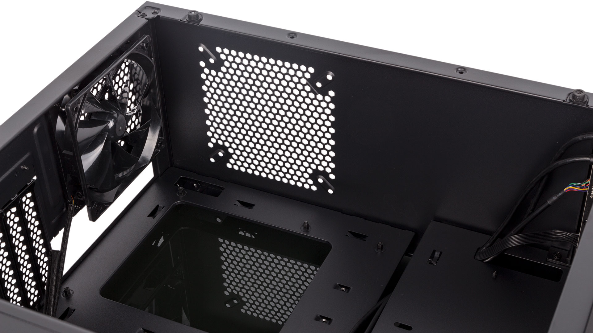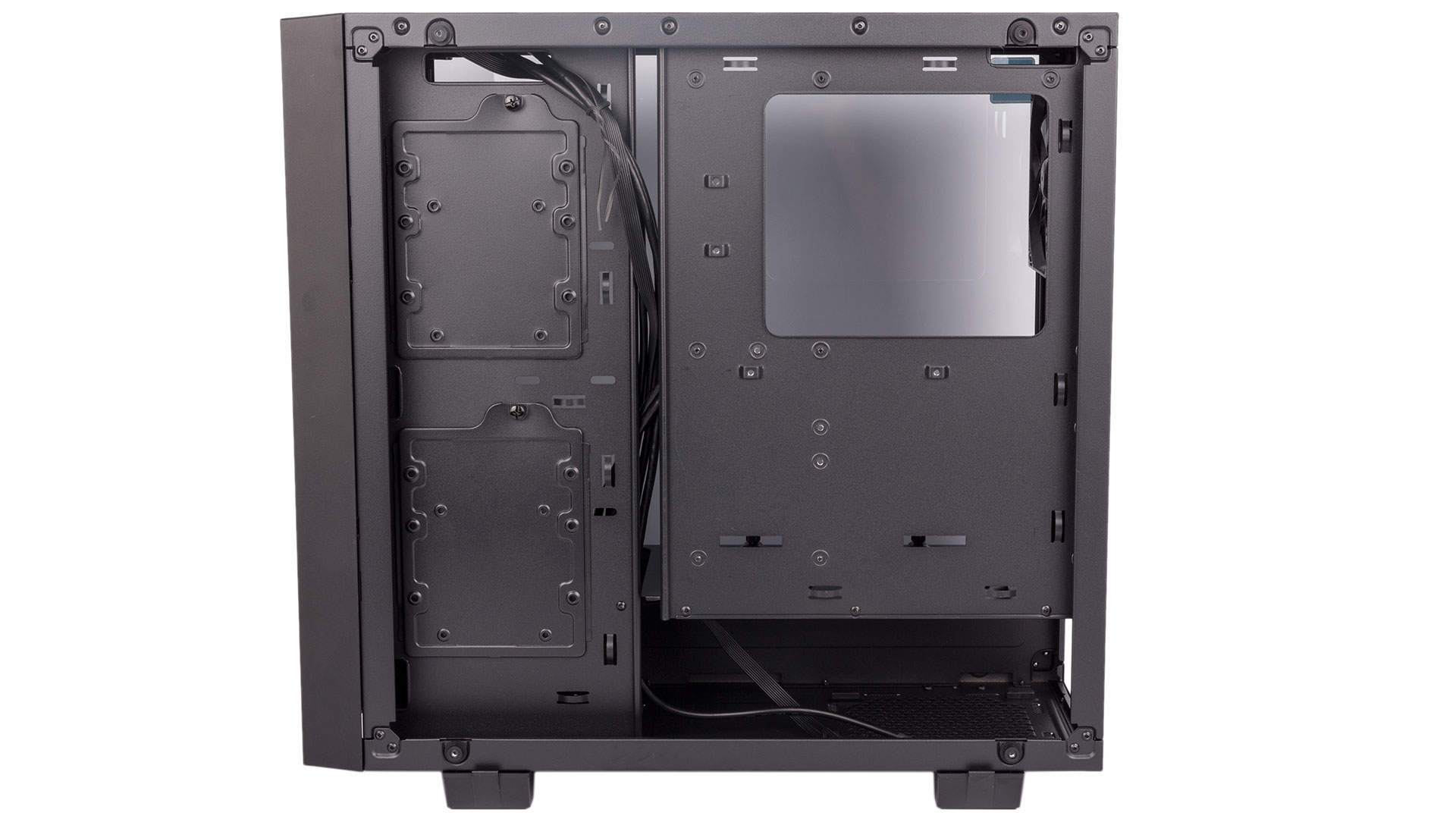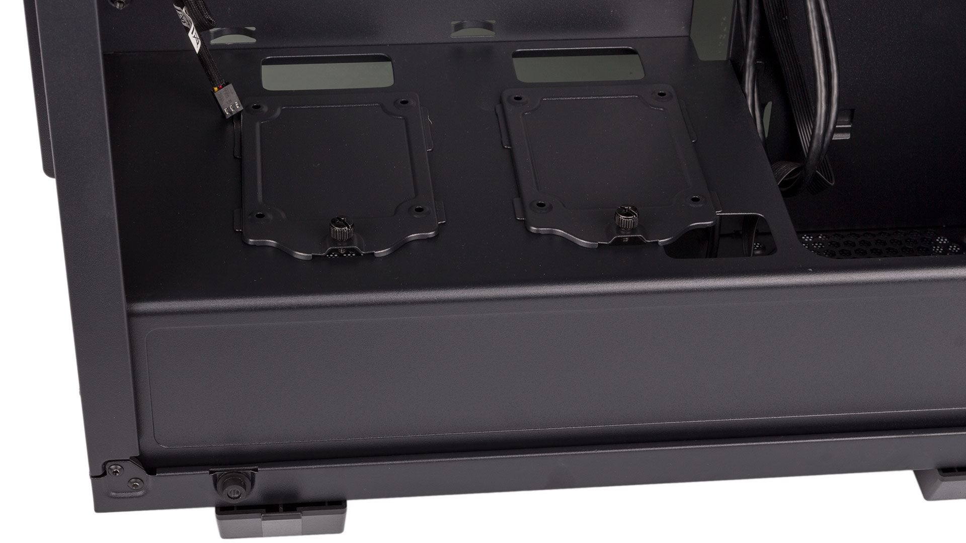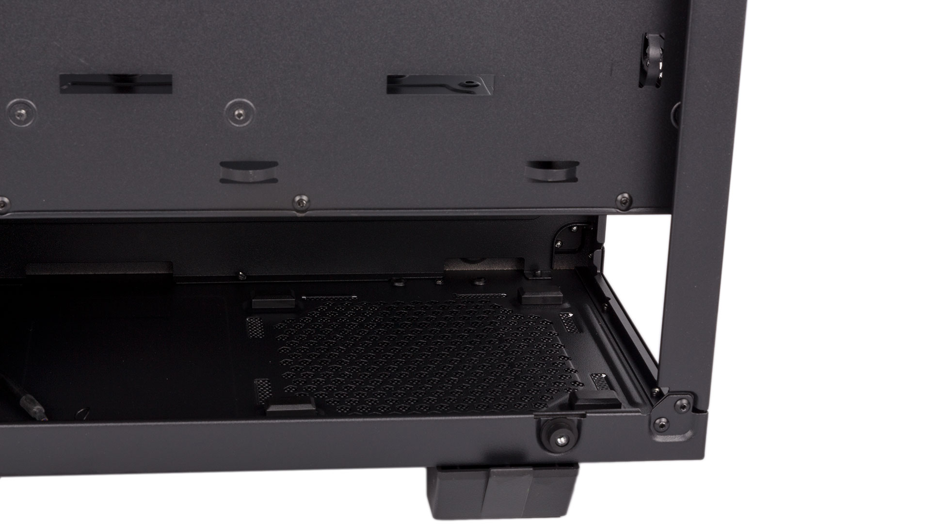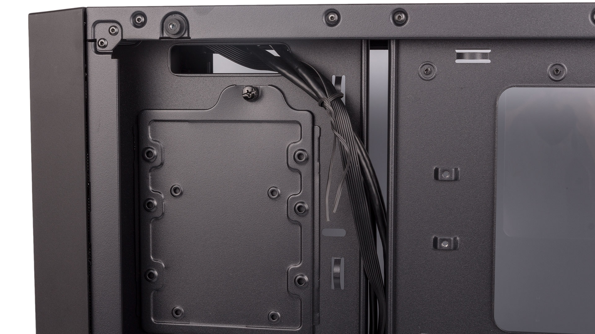 All drives are installed on individual metal trays, each one secured with just a single thumbscrew. This is something that should be commended, as it makes removing or replacing any one of them a quick and painless task. There are two 3.5”/2.5” trays fixed to the right-facing side of the panel up front that's also used to hide cables, and two 2.5” trays secured to the floor of the PSU shroud. These latter two can also be moved to behind the motherboard tray for an even cleaner look. Our only gripe with this system is that no rubber grommets are included for mounting mechanical drives.