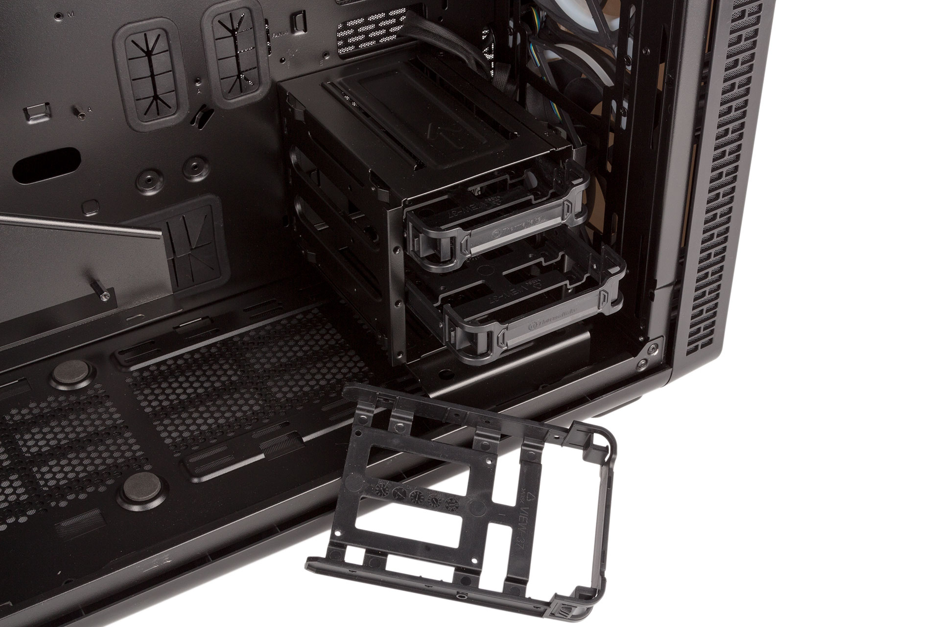 In the bottom-front corner is a three-bay HDD cage. Each bay is filled with a plastic tray with squeeze-to-release clips and a tool-free locking mechanism, although all drives, be they 3.5” or 2.5” models, will need screws to be installed in these. Note that there is no rubber built in to help with keeping vibrations down. As you might have noticed, there are rails atop the HDD cage, which allows you to stack cages and then secure them to the elongated motherboard tray.