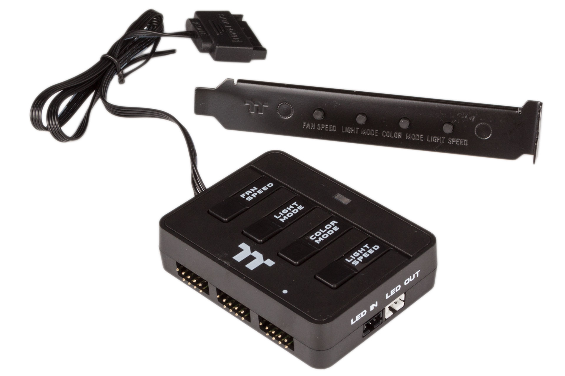 Speaking of cables, you'll also need to accommodate the fan controller, and this isn't really optional since the bundled fans use USB-style headers that plug into the controller rather than regular three- or four-pin fan headers. Still, these fans and the controller are the main reason you'd buy this case and not the non-RGB one, so it's understandable. Velcro pads allow you to stick the controller anywhere there's room. As well as connecting the three fans, the controller also takes a SATA power connection and connects to your motherboard via a PWM cable. It has buttons to control fan speed, light mode, colour mode, and light speed, but since it will almost certainly be inside your chassis, these aren't exactly easy to access. Thermaltake's solution is another cable, this time connecting to a PCI bracket that has those same buttons on for external access. You can even connect it to supported Gigabyte, Asus, and MSI motherboards, this time to the RGB header to utilise their respective RGB software control suites. Finally, extra controllers, fans, and LED strips can be daisy-chained, but you'll need to purchase these separately.