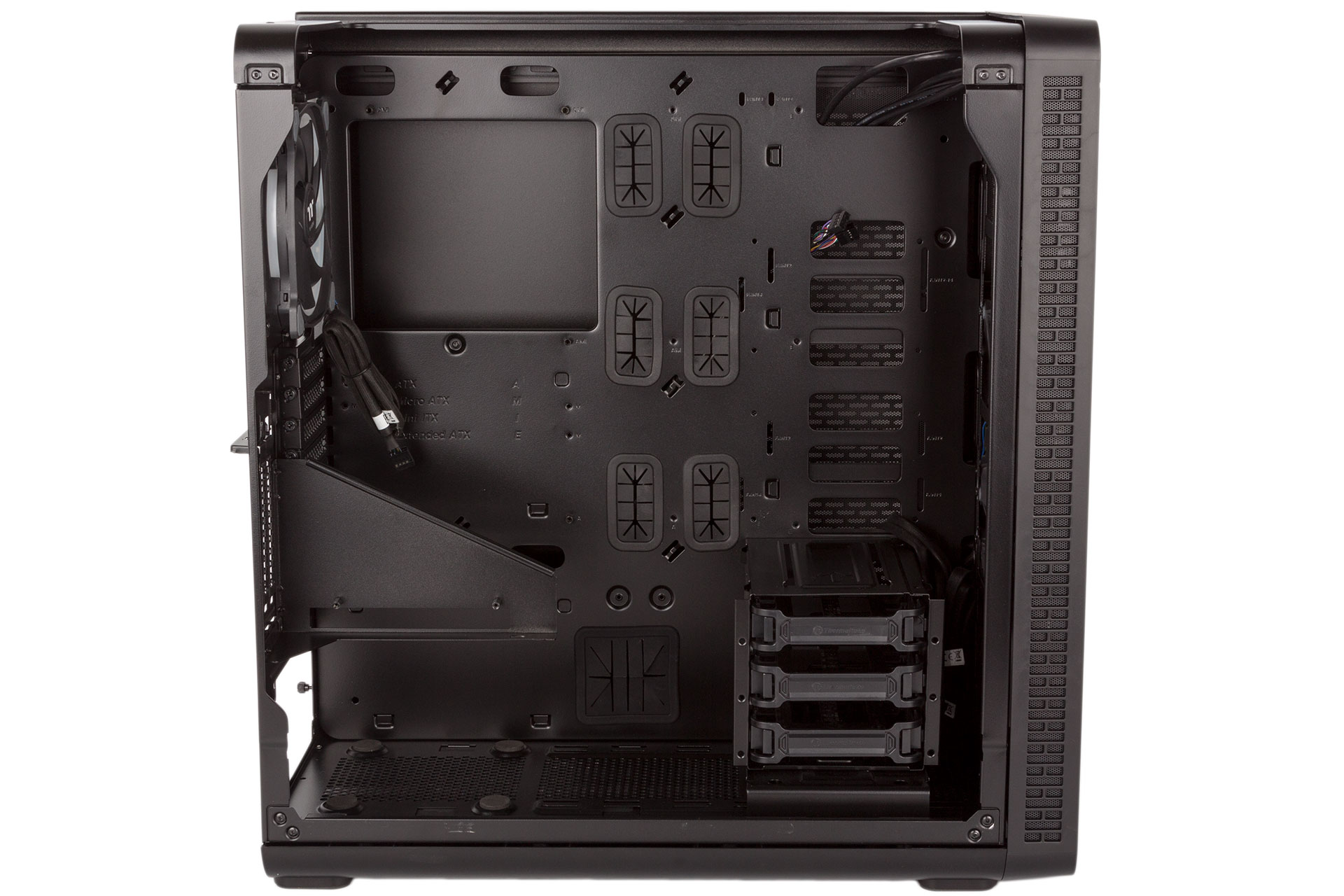 A large hole by the PSU and six smaller ones that run up the middle of the motherboard tray (catering to ATX and E-ATX motherboards) equip the View 37 RGB for cable routing. These are all guarded by rubber grommets, while a couple of smaller cutouts along the top are not. The holes definitely help a lot, and there's a good amount of space between the side panel and tray too, but Thermaltake is a bit stingy in its supply of zip ties, and you don't get any reusable or Velcro ones. We didn't have much issue tidying our rig, but we could see it becoming tougher to work with if that back area started to fill up with drives.
