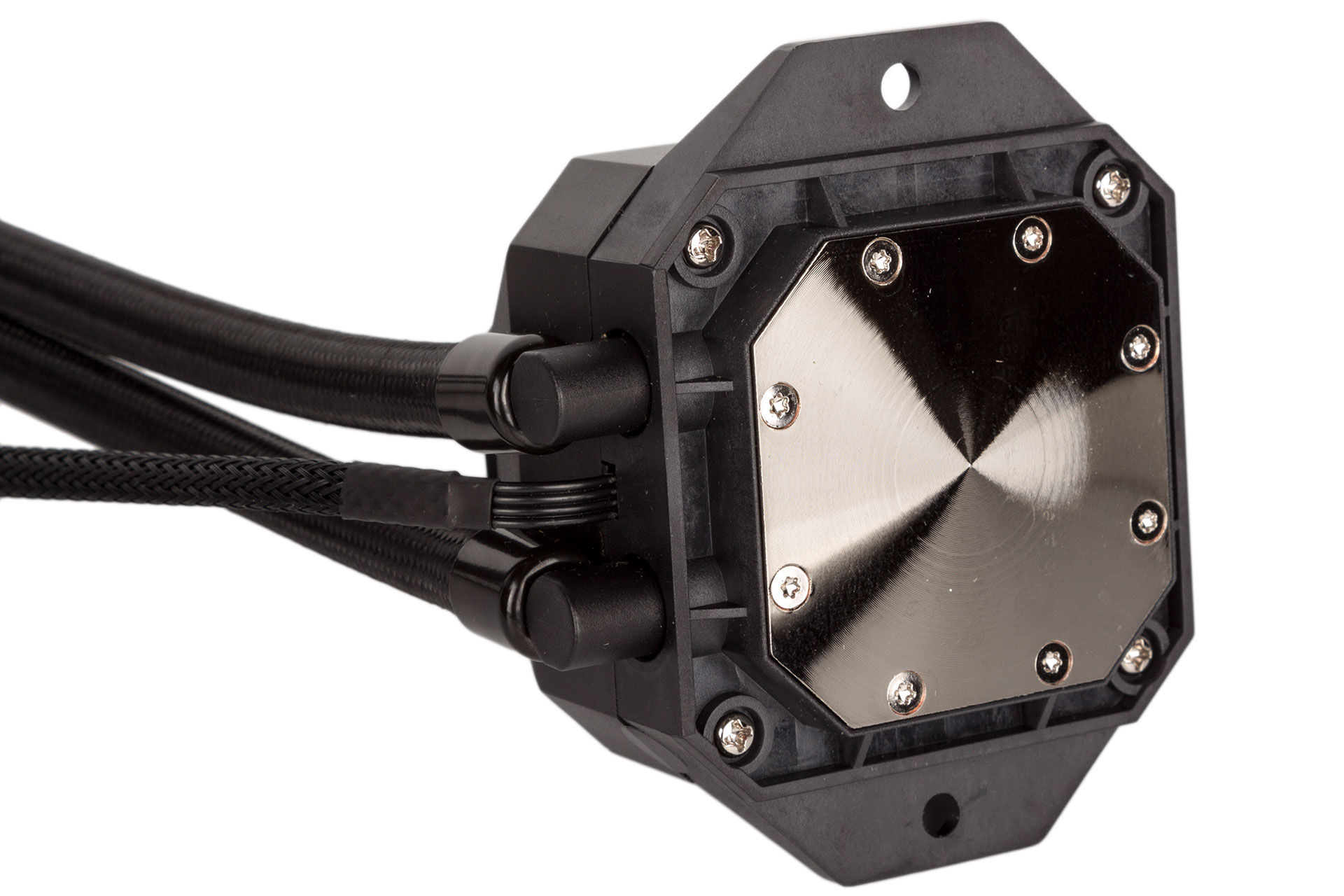 The base of the water block is made from copper that's nickel-plated, and it's large enough to comfortably cover Intel's LGA 20xx CPUs – note that Threadripper is not supported. The housing here is made of thick plastic that looks a bit dated and cheap, but we do like that the mounting holes are built in. This part of the cooler also has a window which should allow you to see if and when coolant levels are depleting, and it also lets you see the flow meter inside. This doesn't really add anything practically, but it is rather unique and cool to see, especially as it's illuminated by RGB LEDs – this is what the braided cable is for.
