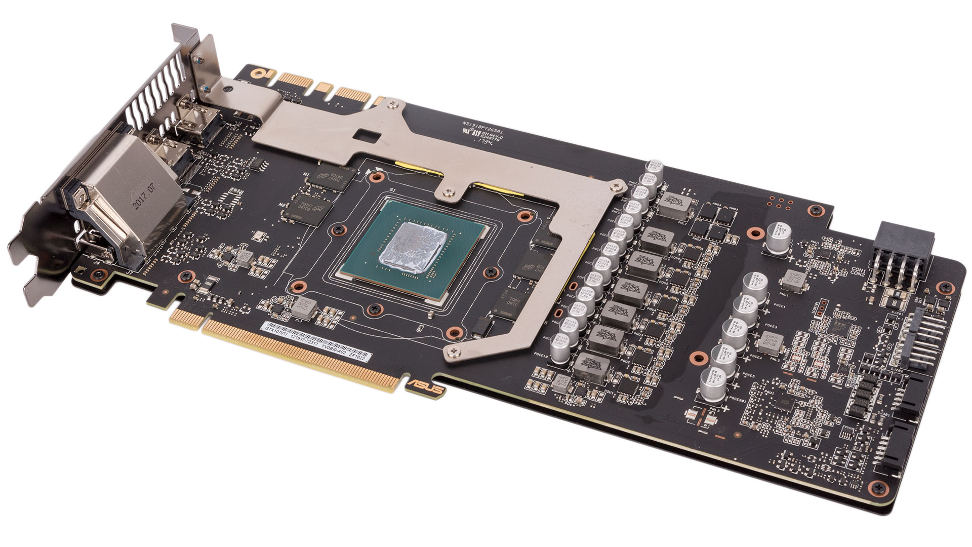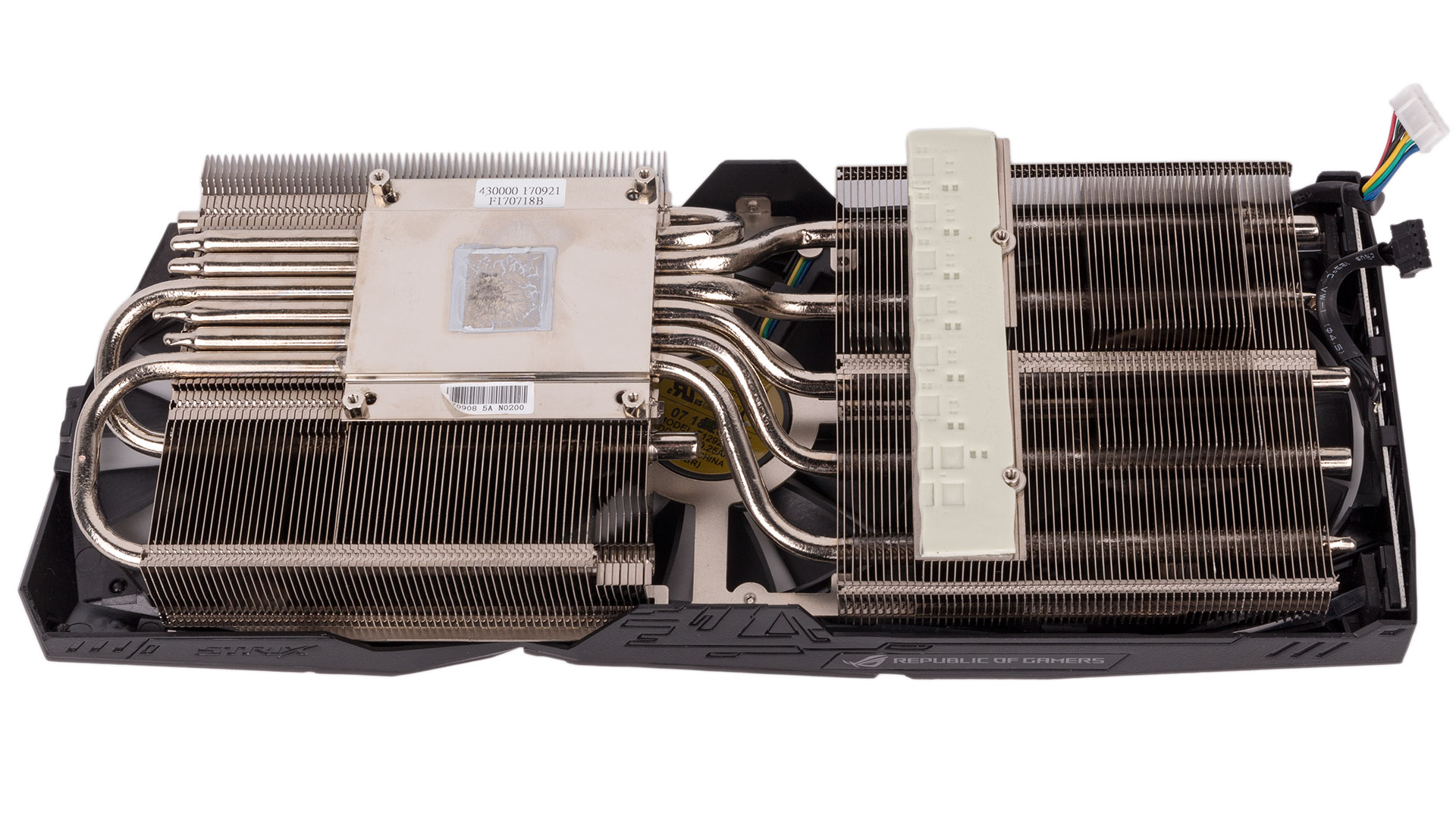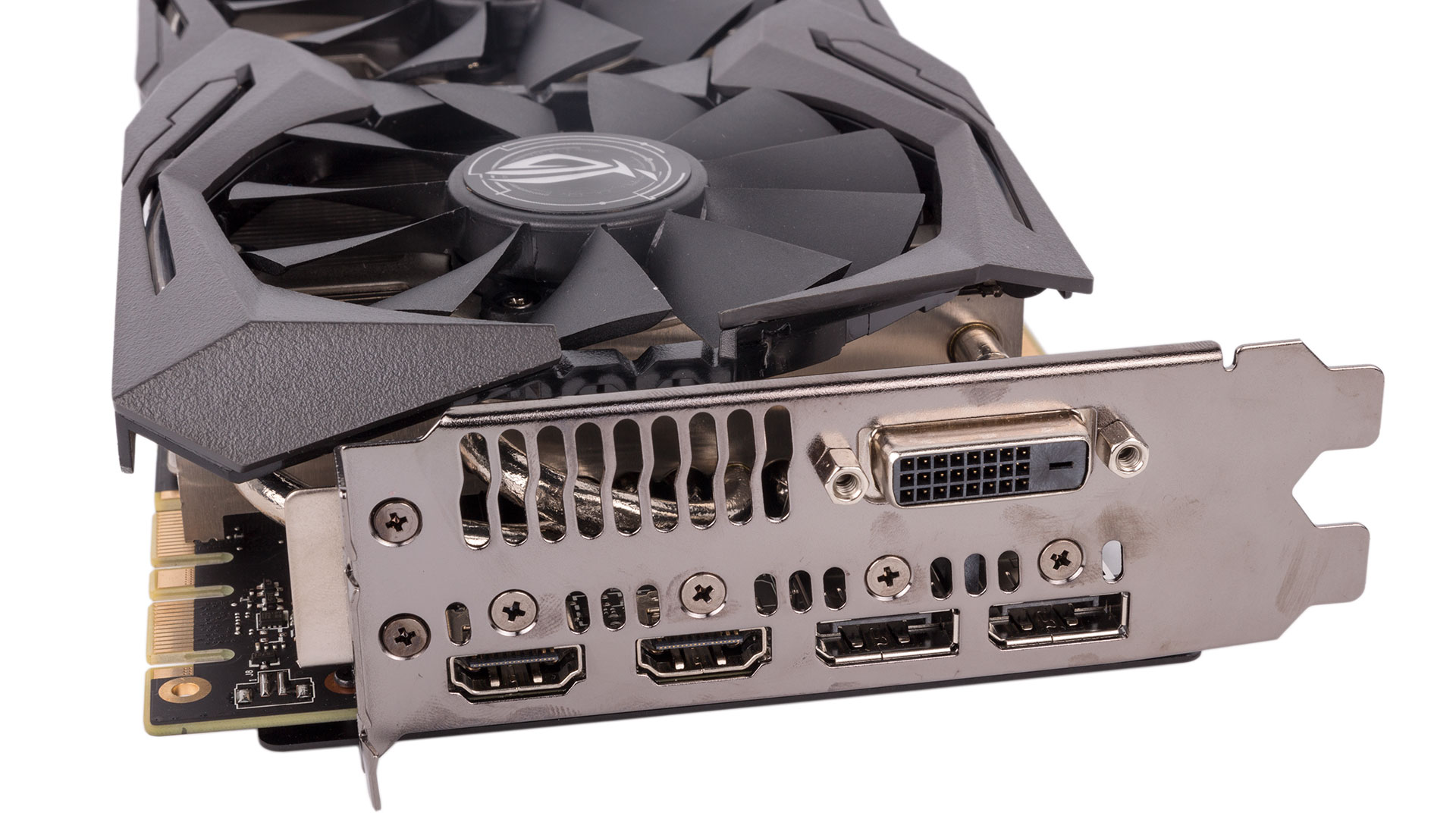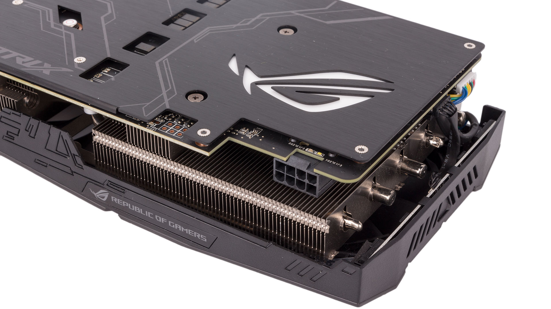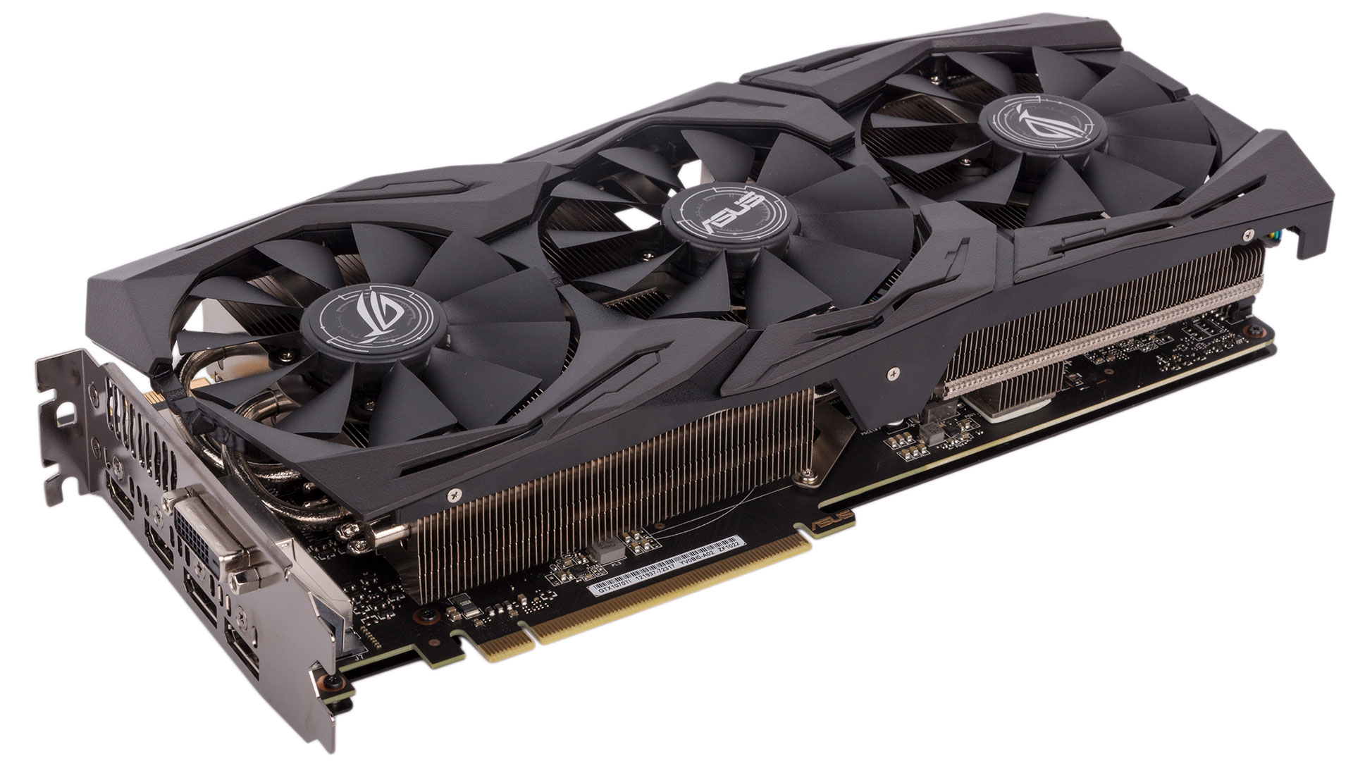 Three of Asus' patented Wing-Blade fans, which are IP5X-certified against dust intrusion into the motor, cool the heatsink apparatus. The open shroud means most airflow will be recycled in your chassis. The fans are all semi-passive and will switch off completely whenever the GPU is below 55°C, which covers all light and idle workloads.
