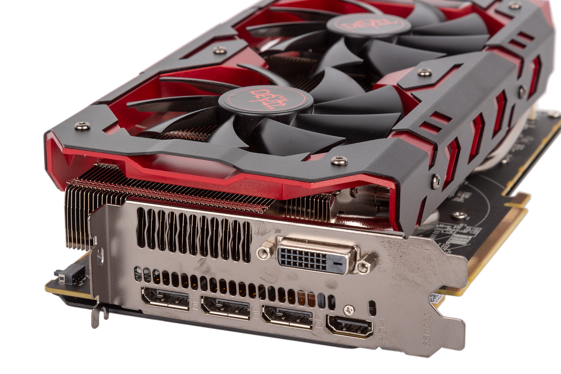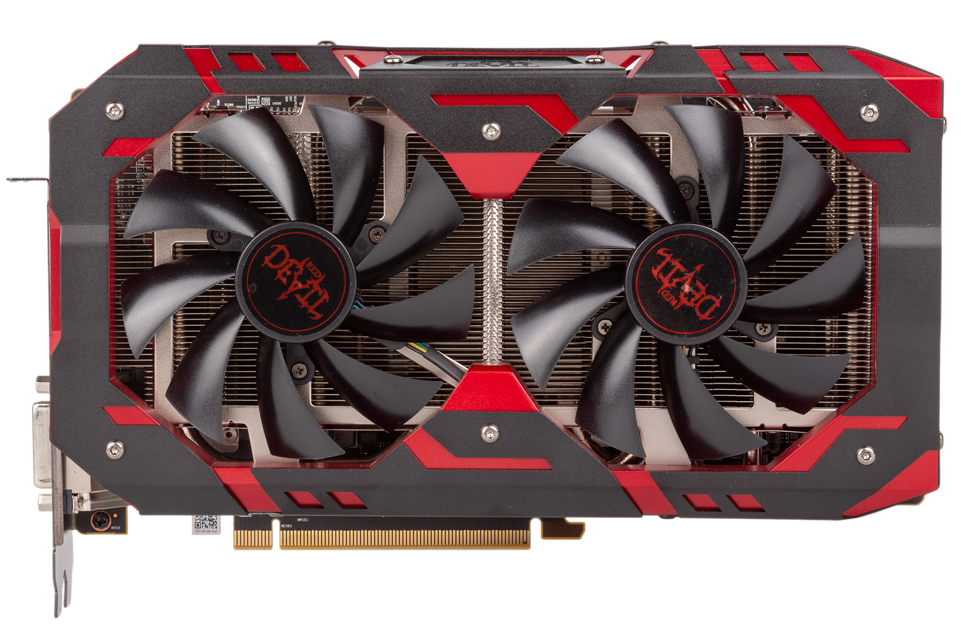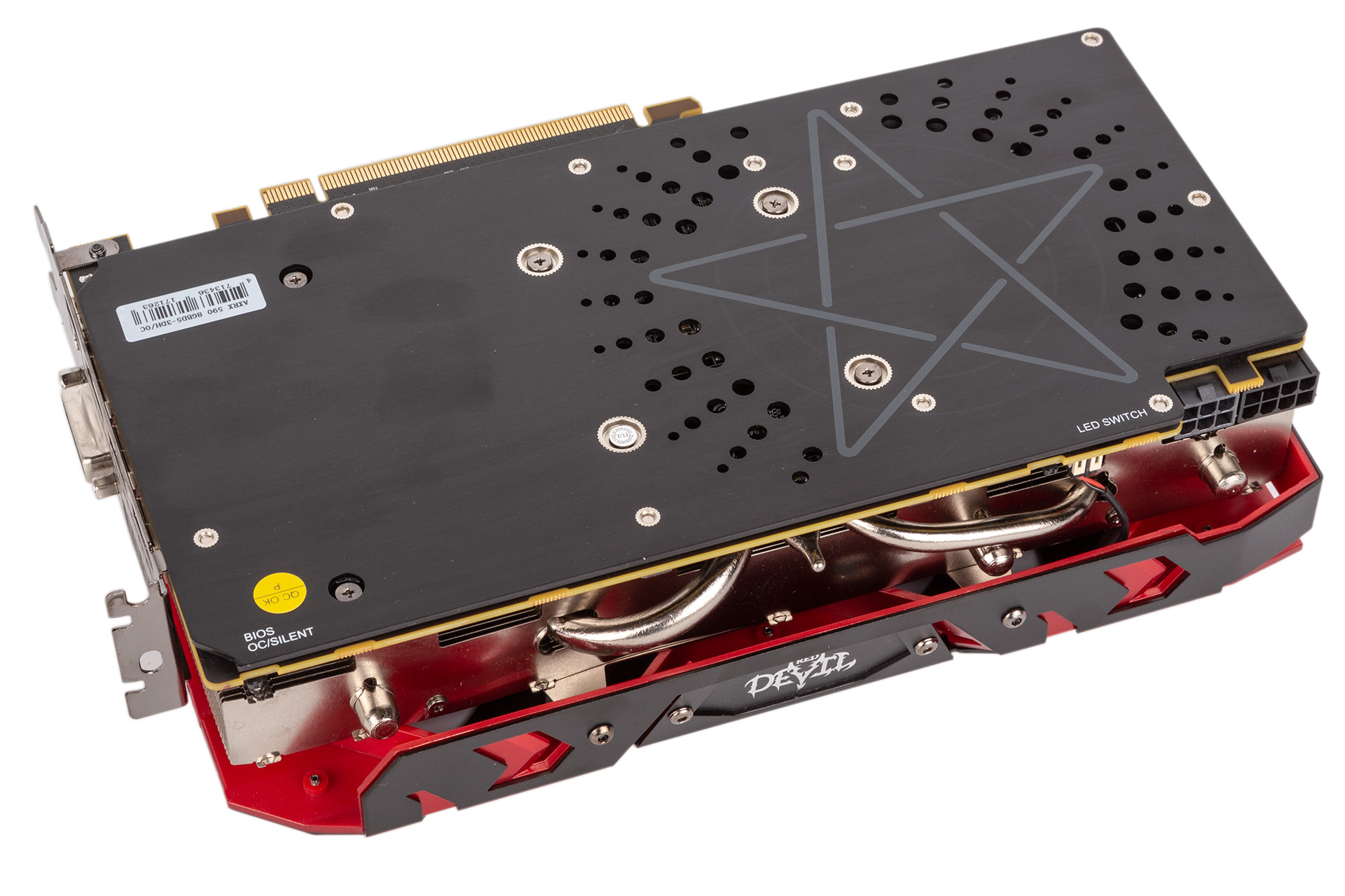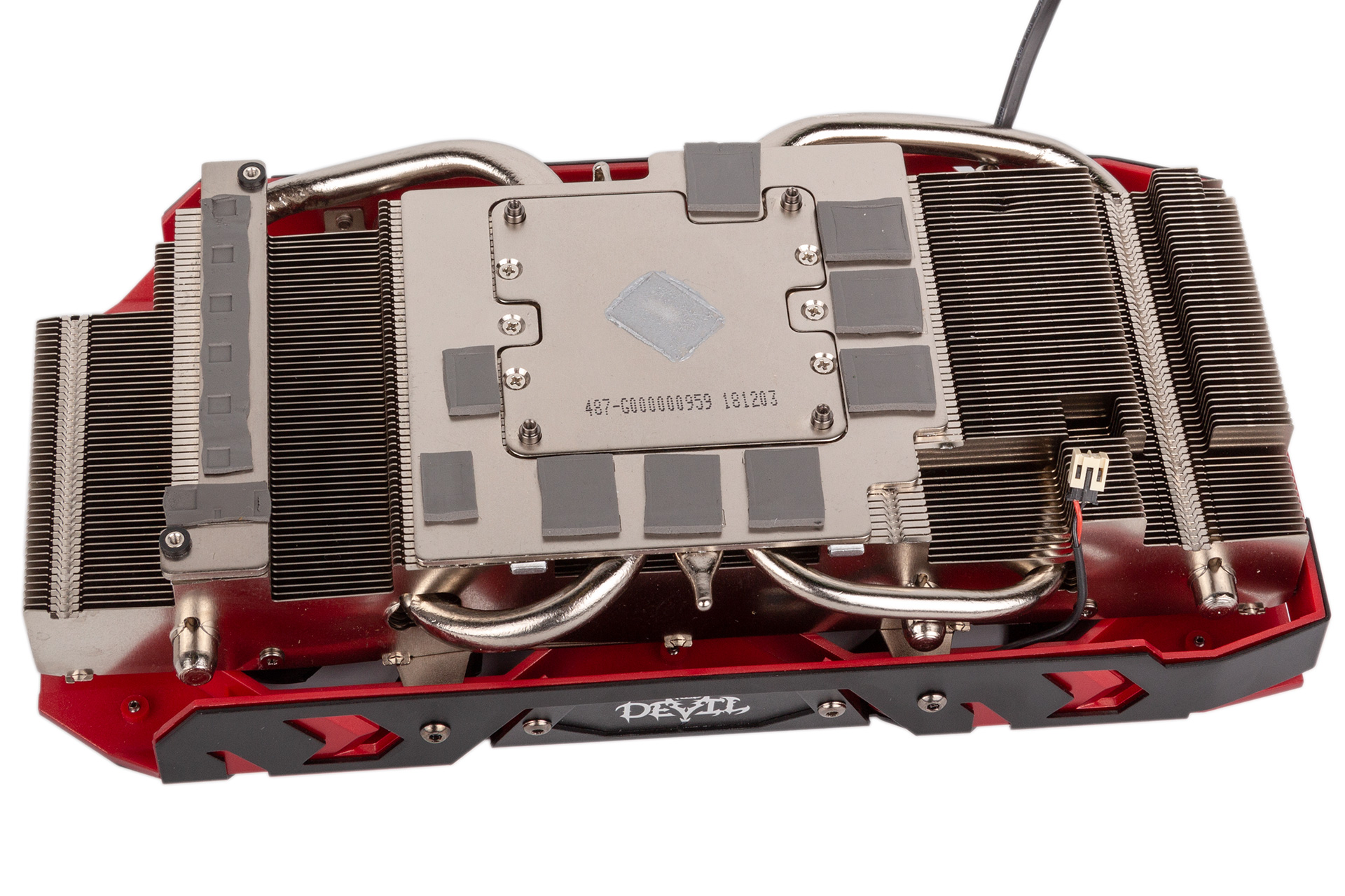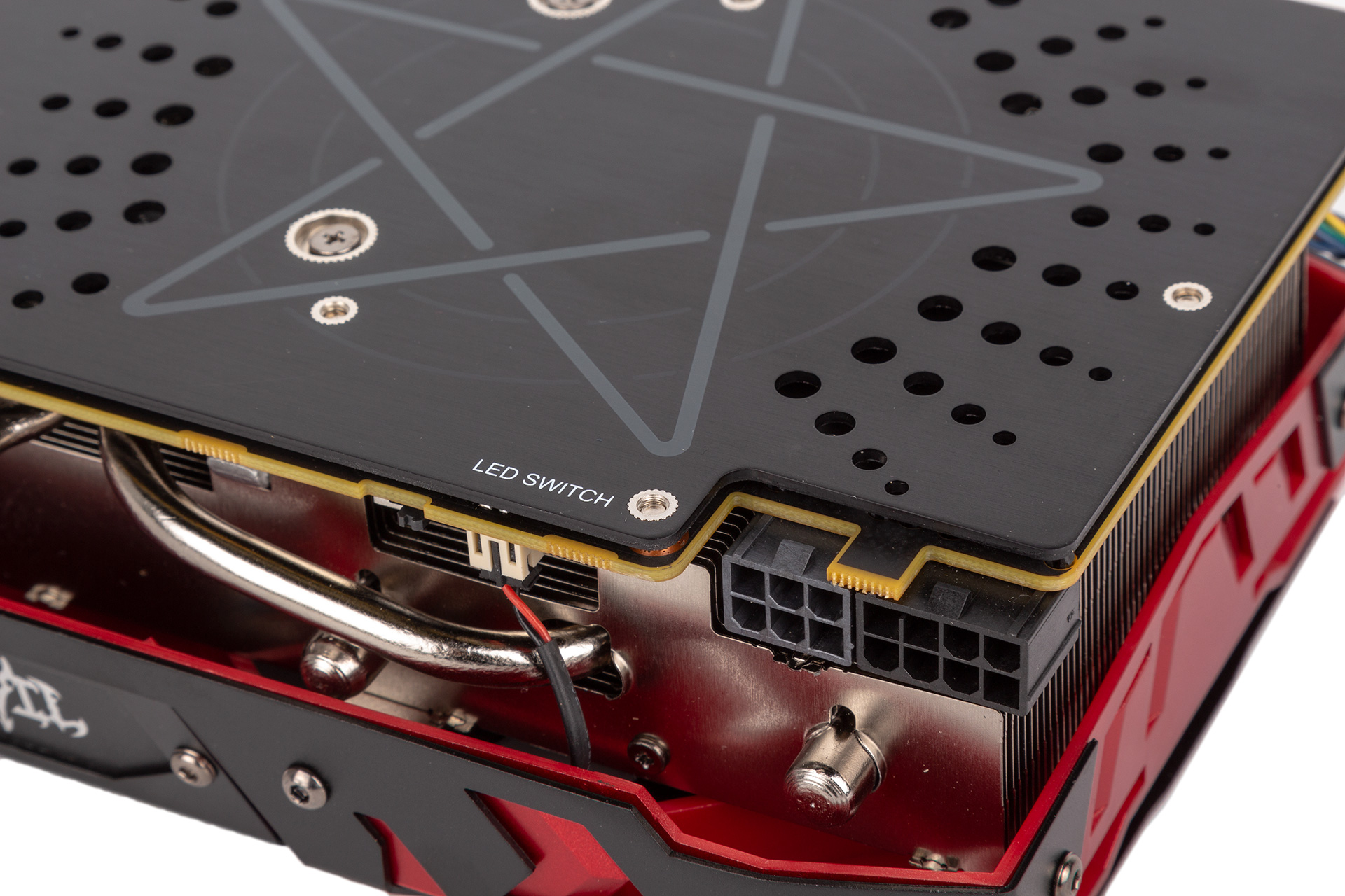 Build quality is high here; there’s a real robustness to the card thanks in part to the metal backplate (complete with pentagram branding…) and in another part to the metal that’s used to reinforce the red plastic cooler shroud. Sadly, the backplate isn’t used for direct cooling of the card, as there are no thermal interface pads between it and the PCB.