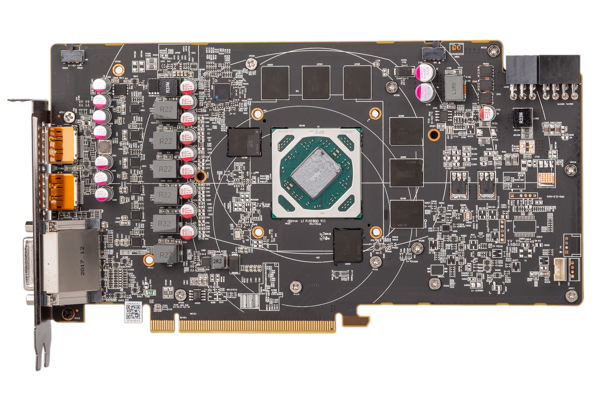 The heatsink is nice and hefty, sporting five heat copper pipes (four 8mm, one 6mm) with a composite design. These pass through a large copper baseplate and feed the singular large stack of aluminium fins. Nickel plating makes for a consistent finish that’s better looking than XFX’s exposed copper, and the design takes care of the memory and key VRM components too thanks to thermal pads.