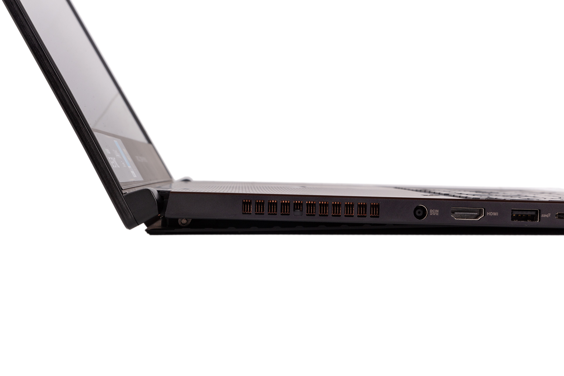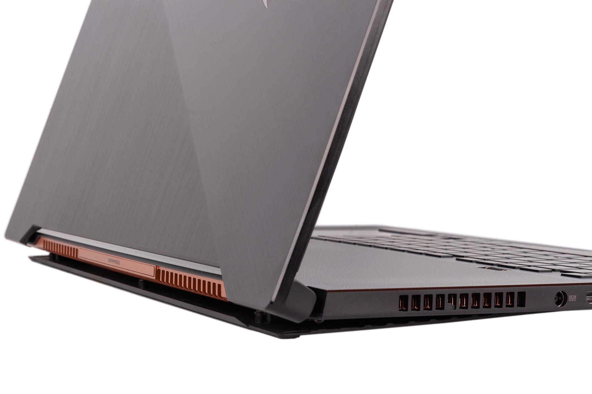 It’s as you open it that the cooling-focused design choices mentioned earlier become obvious. The Zephyrus S GX701 has a hinged panel on the underside instead of the usual vents, which opens up and raises the laptop slightly as you open the lid, creating a sizeable gap through which air is exhausted in addition to the more regular side vents. This looks odd, but of more concern is that the plastic panel is somewhat flimsy.
