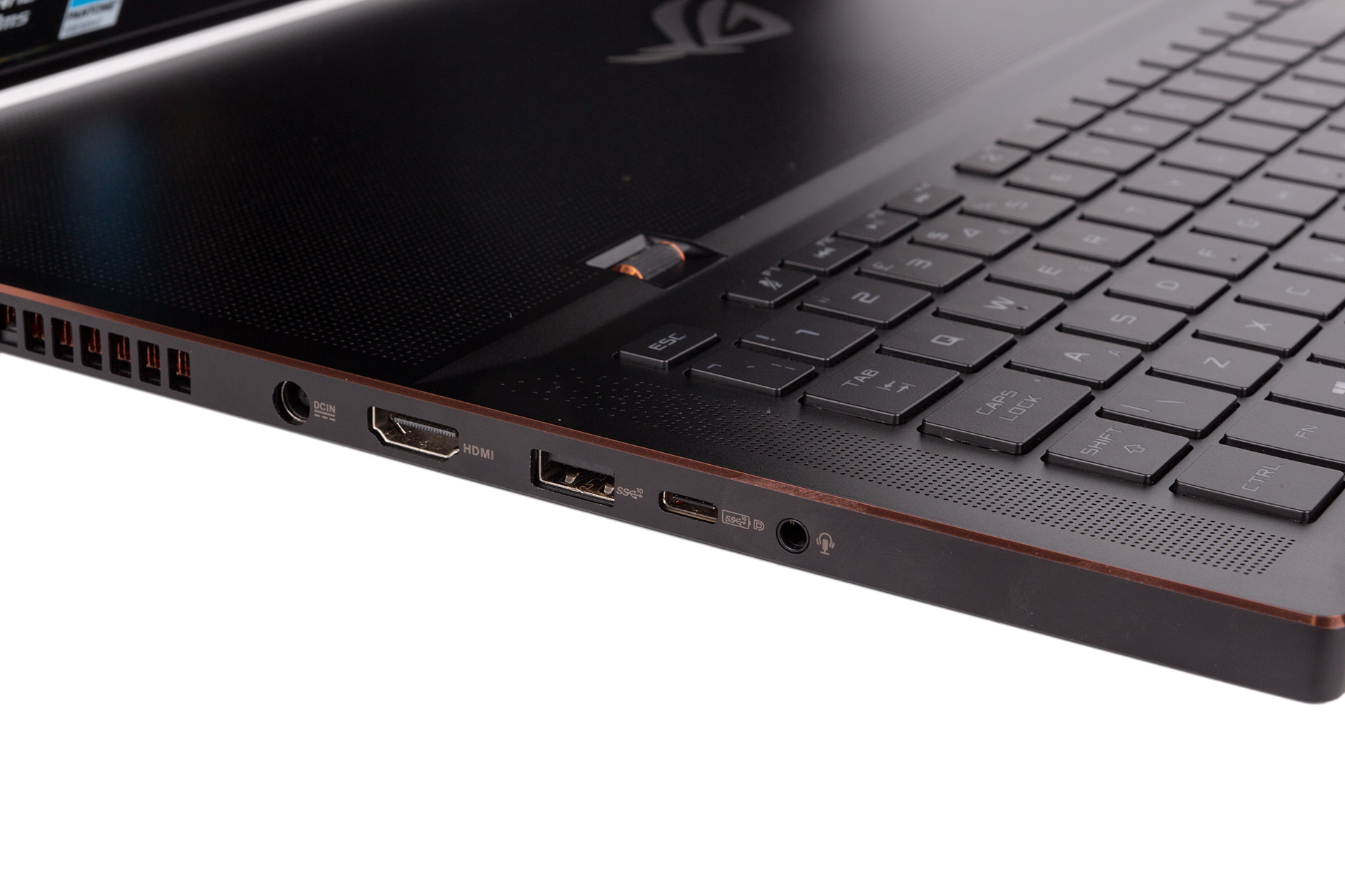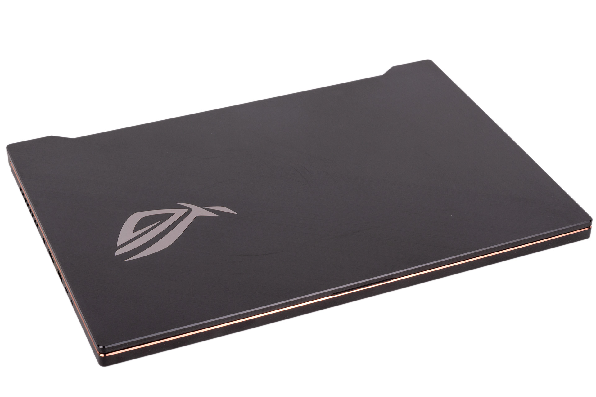 The outer shell is clad in a magnesium alloy, and this is given an attractive brushed finish on the lid. The shiny ROG logo and bronze trim are stylish additions that bling things up without becoming tacky. The unit is mostly very well built and solid all around. The hinge is smooth enough to allow you to open the laptop one-handed, with the rubber pads underneath helping to prevent the bottom slipping around.