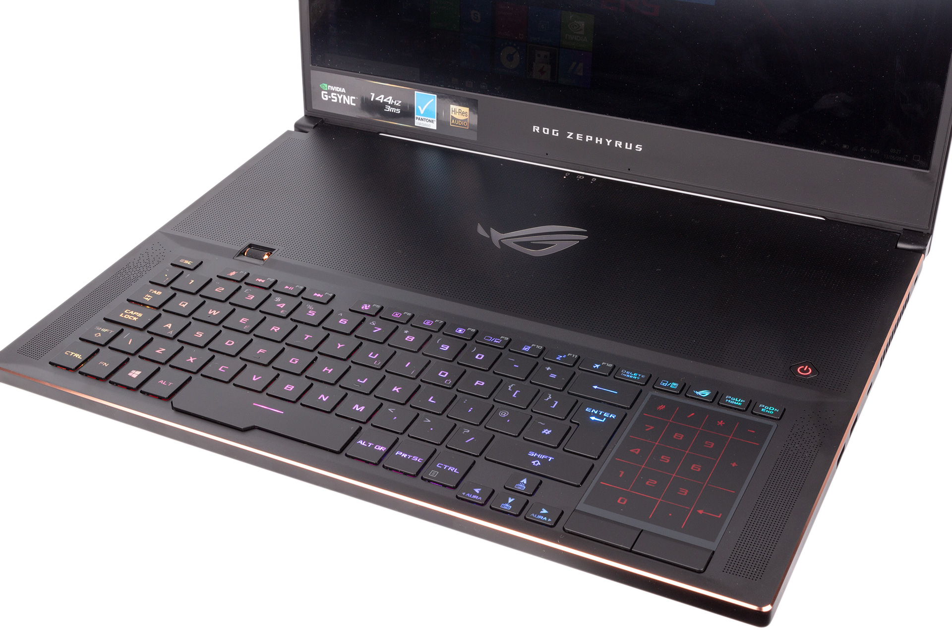 At 399mm wide, 272mm deep, and under 19mm thick, the Zephyrus S GX701 is small as 17” laptops go, and the weight of 2.7kg makes it acceptable for taking it from A to B. That’s hardly something you’ll want to do daily, but that’s also not really the point of a 17” form factor, which is better suited to desktop replacement duties.