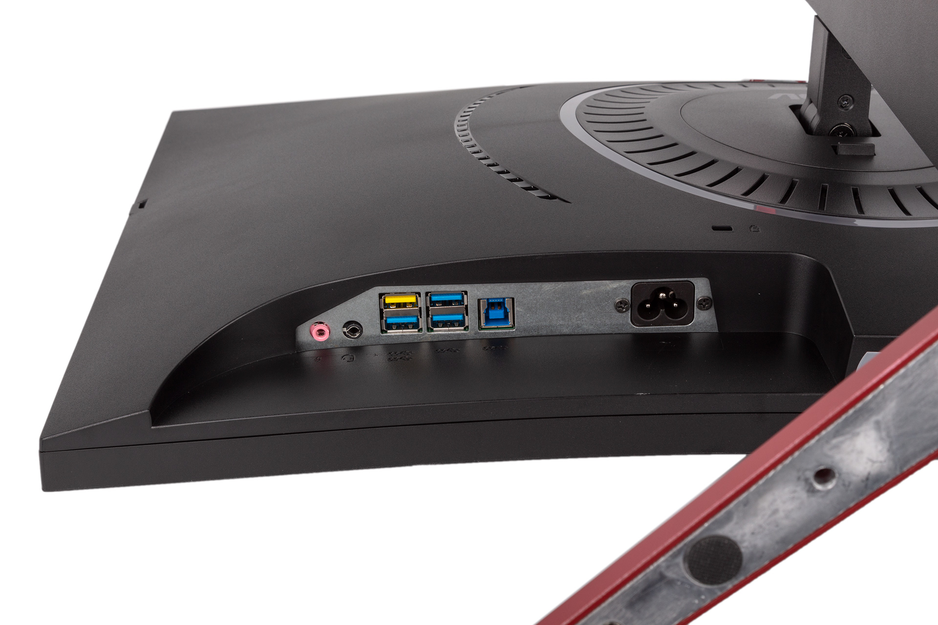 Fresh from the box, the base needs attaching to the stand, and this is easily achieved via a single pre-attached, tool-free screw. The base and stand both have sturdy metal interiors with external plastic coats sporting a red and black aesthetic. The screen itself then clips into and locks onto the stand all without the need for tools. It features the popular design of having almost no plastic visible on the side and top edges and a relatively thick bottom plastic bezel. This isn’t a true bezel-free monitor, as there is the common small in-panel border to keep in mind too.