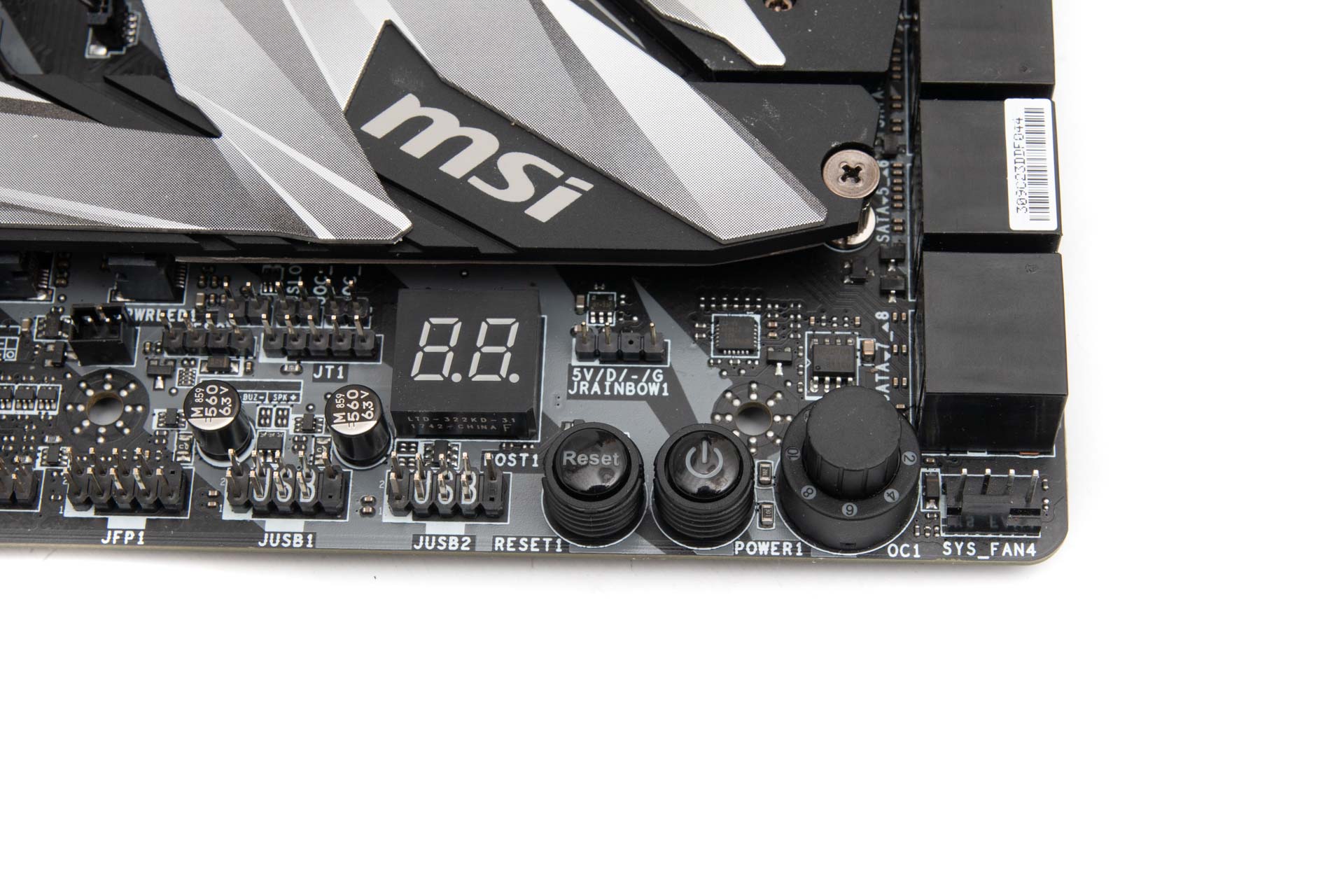 There are plenty of overclocking and testing tools, from debug LEDs at the top of the board to the usual POST code display, power and reset buttons, and MSI's Game Boost Knob, which allows you to dial in overclocking presets or for some additional control. There are also jumpers that can be shorted to increase or decrease the base clock, while on the rear I/O panel you get MSI's USB BIOS flashback and CMOS clear buttons. As well as these you get a trio of thermal probe headers with probes included in the box. There are ten fan headers too including the usual high amp one dedicated for water cooling pumps that can dish out up to 2A/24W, and all are fully configurable in MSI's EFI or software of course.