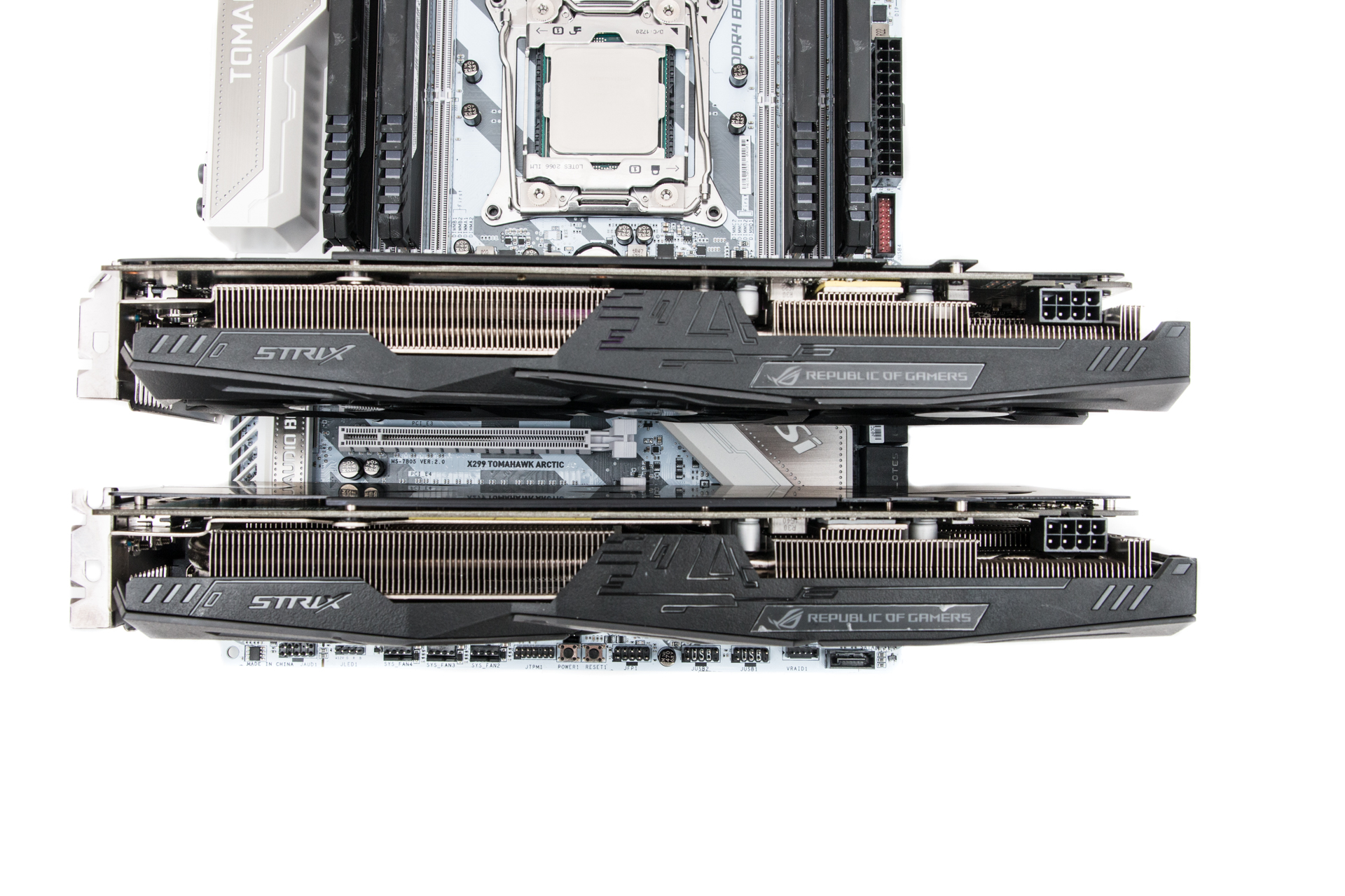 If you're gunning for a two-way GPU setup, a pair of dual-slot, air-cooled cards will leave plenty of space between them for cooling, although as you can see, this does render many of the ports, including M.2, fairly inaccessible.