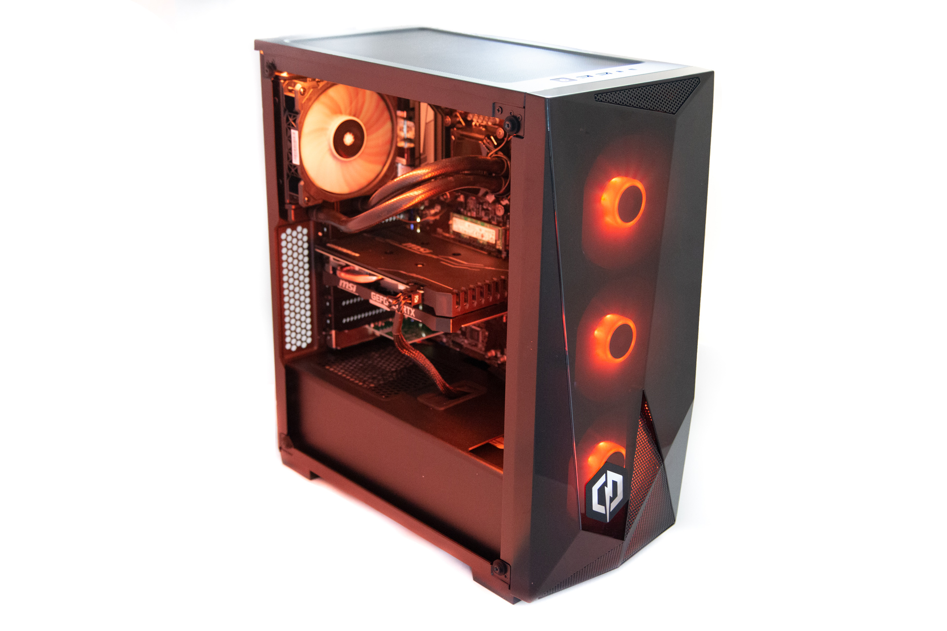 We'll start with our only main gripe here, which is the CPU cooling. Out of the box, the CPU hit 97°C in our combined load test, and that's a little toasty in our books. Admittedly, both the graphics card and CPU were under full load, which isn't likely to happen in the vast majority of typical use cases this PC is aimed at, but we'd have concerns on warm days if you were to throw video editing or rendering tasks at this PC. Interestingly we also spotted that the AIO cooler fan had been connected to a system fan header, and the pump was connected to the CPU fan header rather than the dedicated pump header.