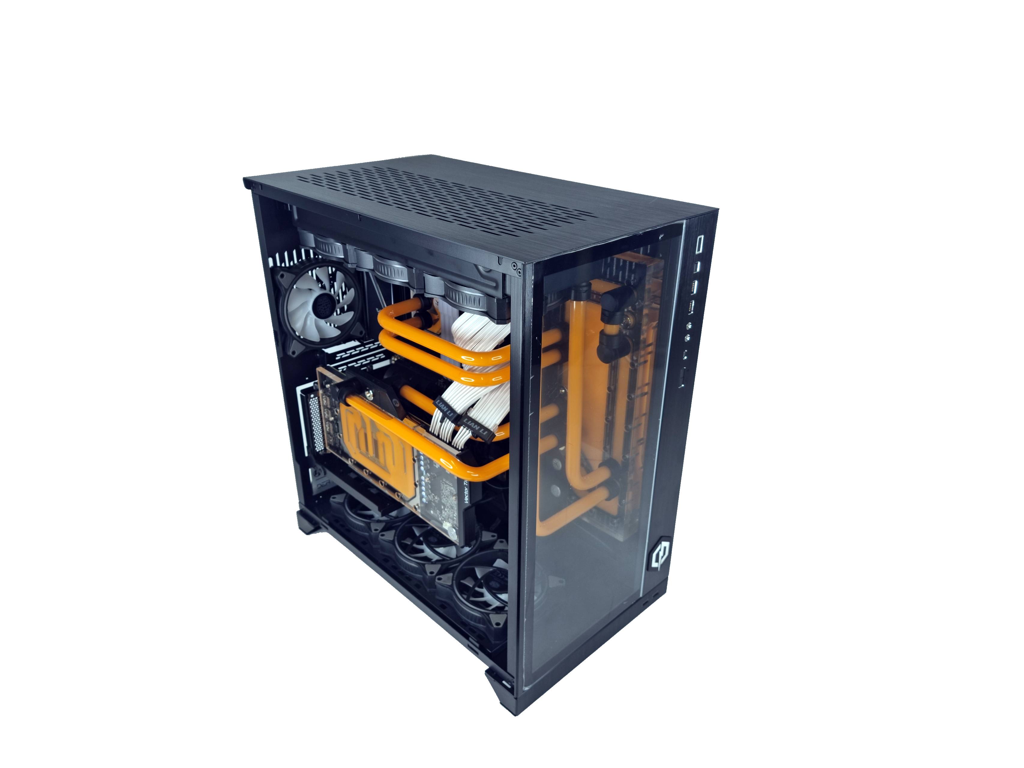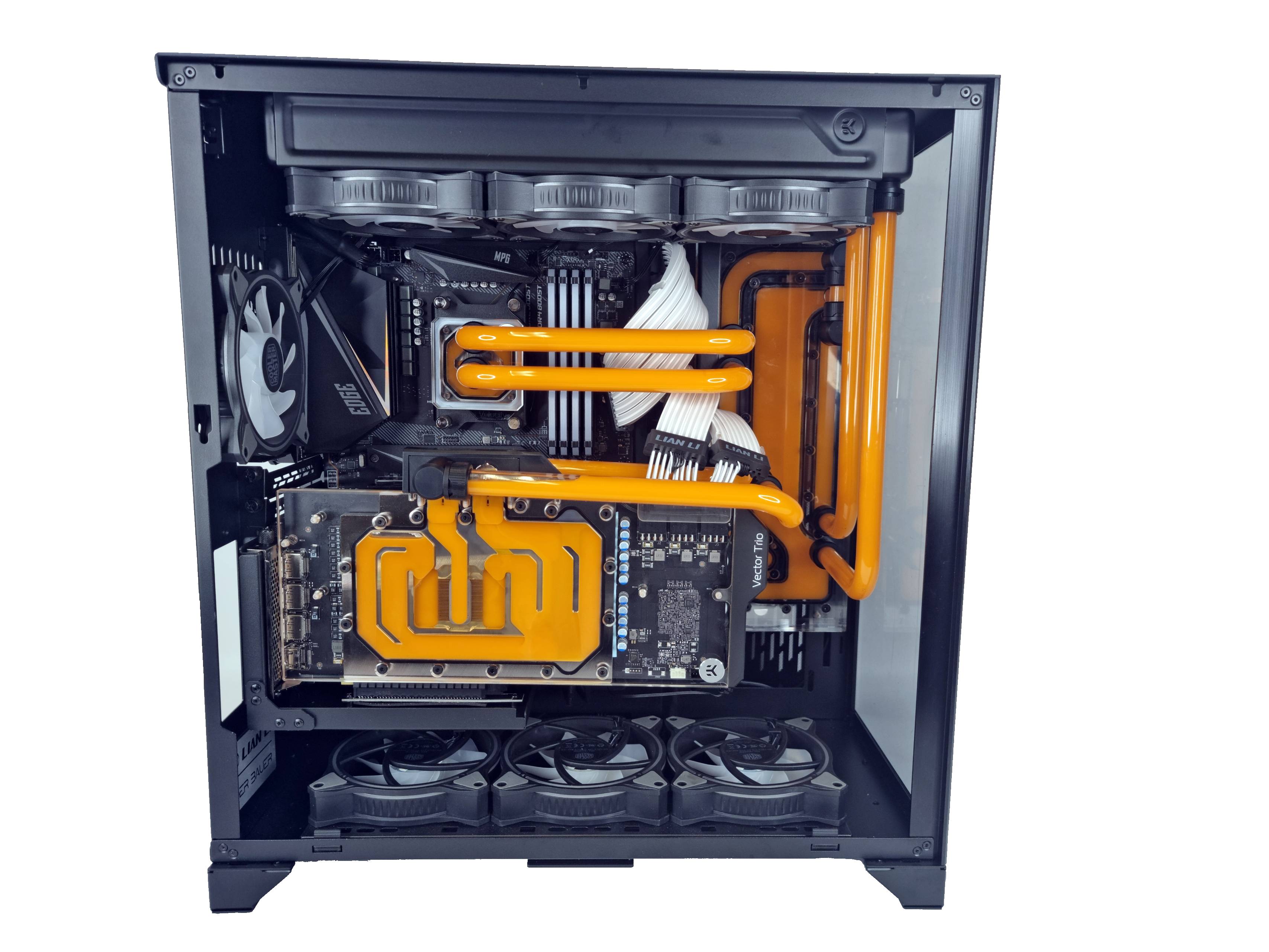 EK is a good choice for overall cooling. A 360mm radiator offers enough concurrent cooling capacity to take care of the stock-clocked AMD CPU and marginally overclocked graphics card. The actual GPU brand is of less importance as it's stripped down to accommodate the EK-Quantum Vector Trio block. It's nice to see vertical mounting, too.