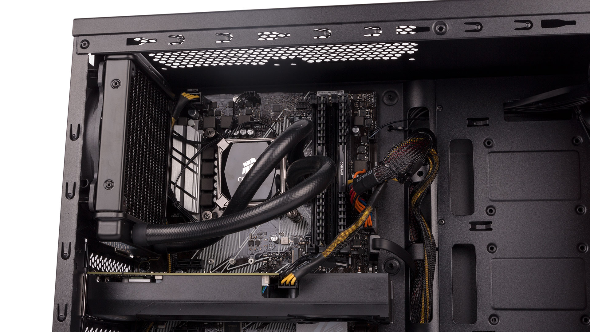The Corsair Hydro Series H60 cooler is a bog-standard all-in-one cooler with a slimline radiator and single 120mm fan fitted as a rear exhaust. It will be more than powerful enough to deal with heat from the Core i5-8400. Its fan will balance the system airflow, which means there's no positive pressure to help keep dust out of the top vents, so it could easily build up over time. The case fan and CPU fan are connected to the appropriate headers on the motherboard, although we noticed that the pump was connected to a chassis fan header rather than the dedicated AIO pump header. It's hardly likely to make a difference, but it would actually have been neater from a cabling perspective to use it. All fan control settings in the BIOS have been left at default settings.