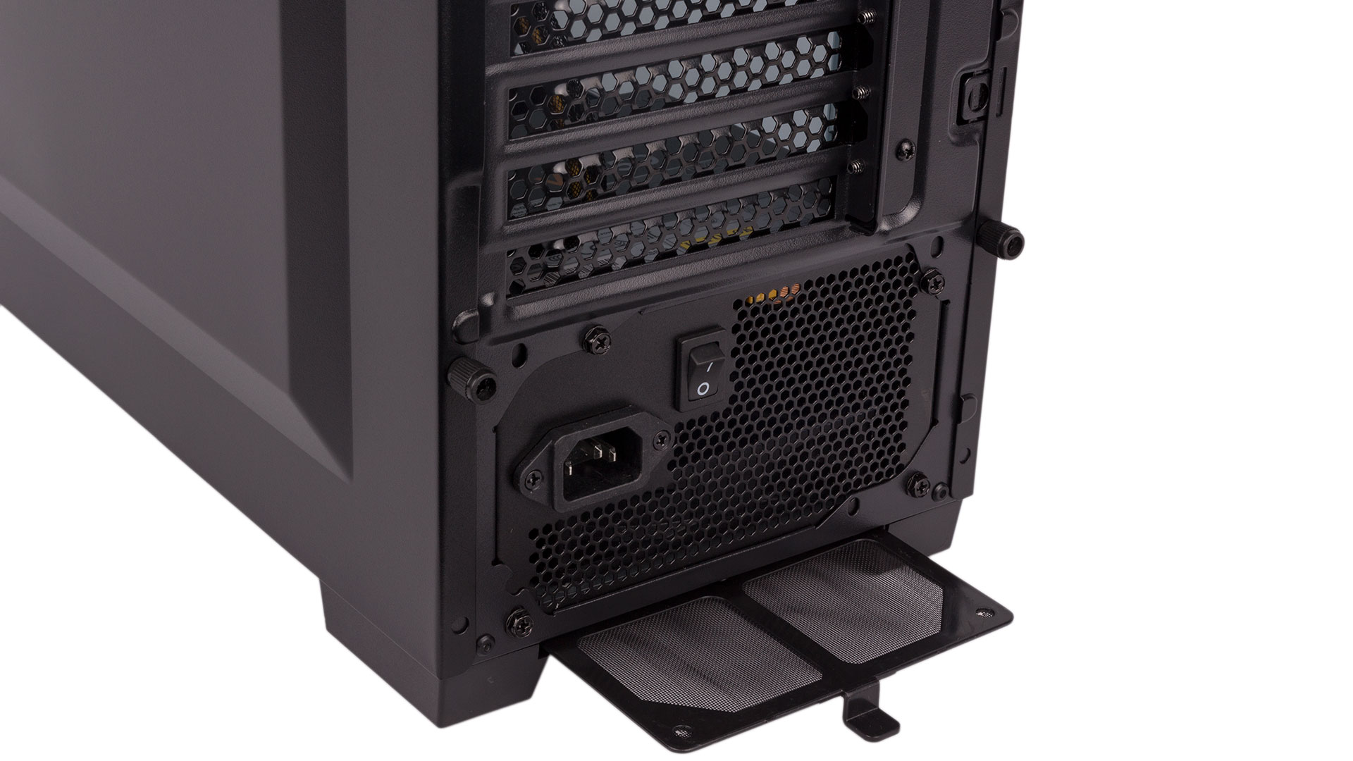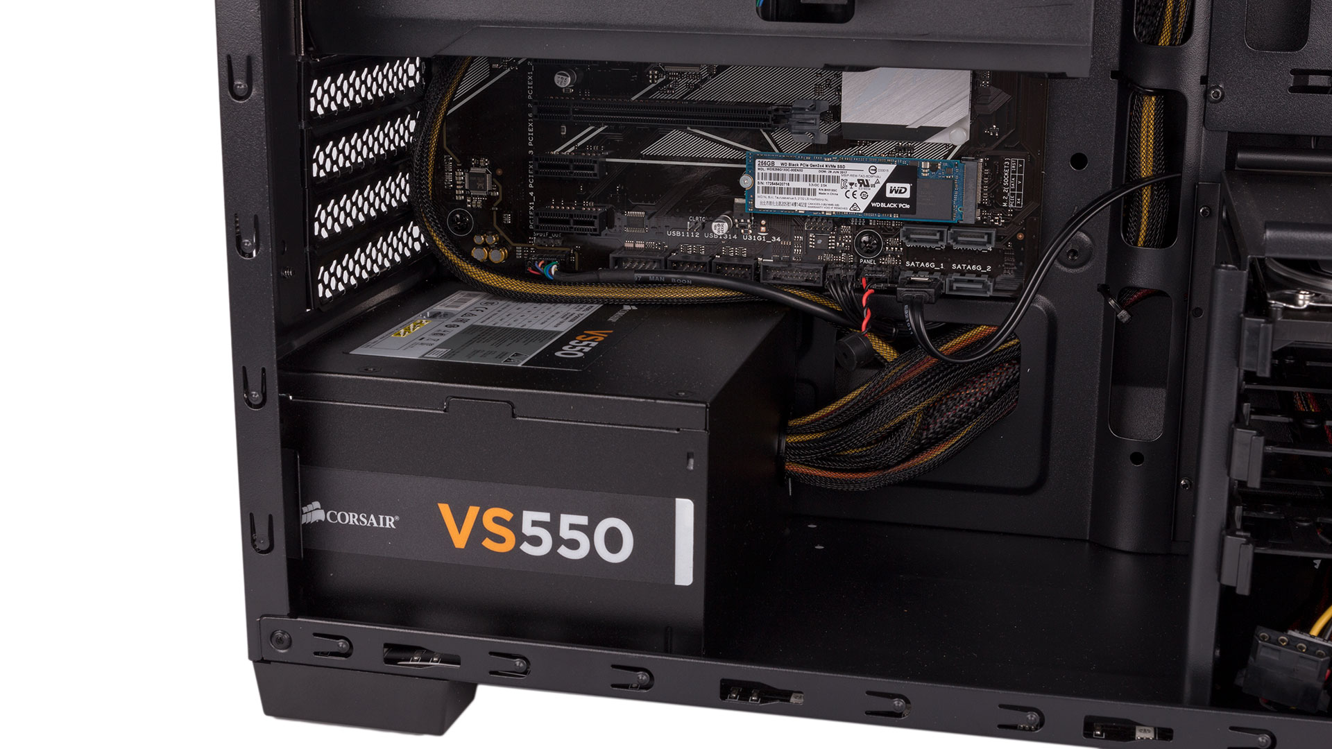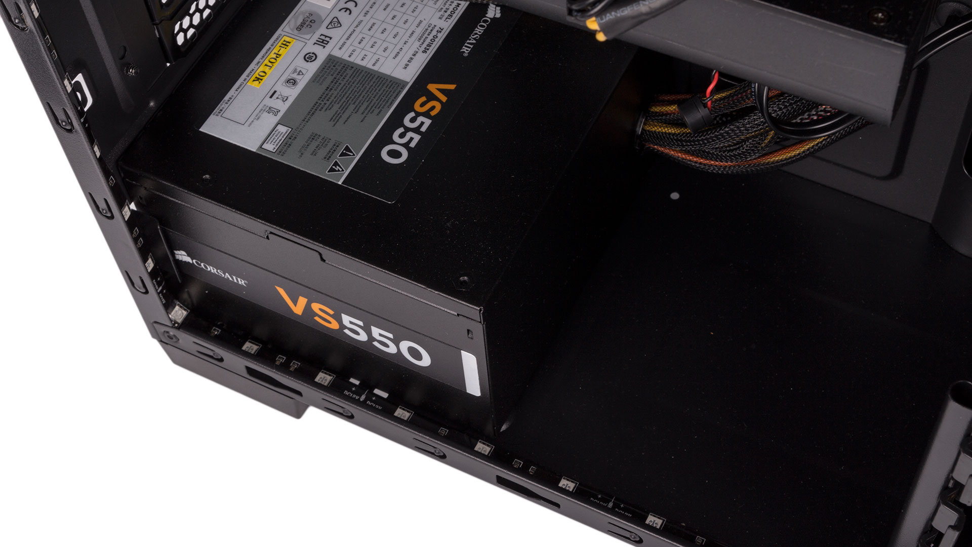 Another entry-level component is the Corsair VS550; it has non-modular cables, an 80 Plus White rating only, and its fan never turns off. Nevertheless, it's from a reputable brand and has more than enough wattage for the components it powers.