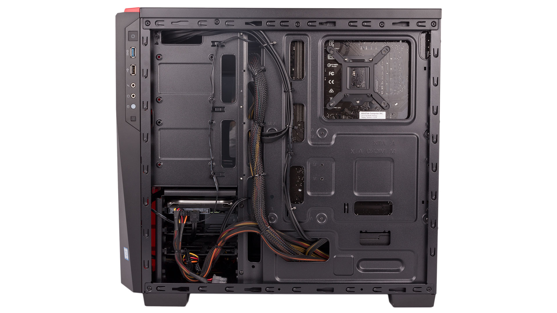 Opening the case, we found that the weight of the HDD had caused the plastic tray it sat on to fall down the drive tray, despite the tray being secured on one side with a screw. Undoubtedly a shipping issue that was easily remedied, this is still noteworthy, as it points to the lower than usual quality of the case itself. Otherwise, there are no build quality issues to note, and PC Specialist has done a great job of cable routing considering the non-modular PSU and the case used.