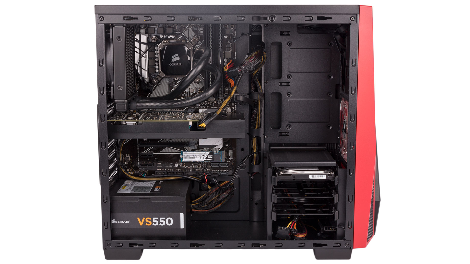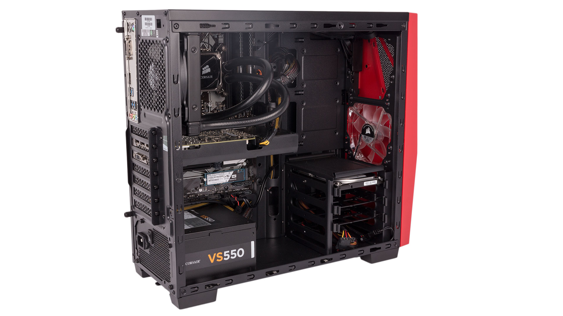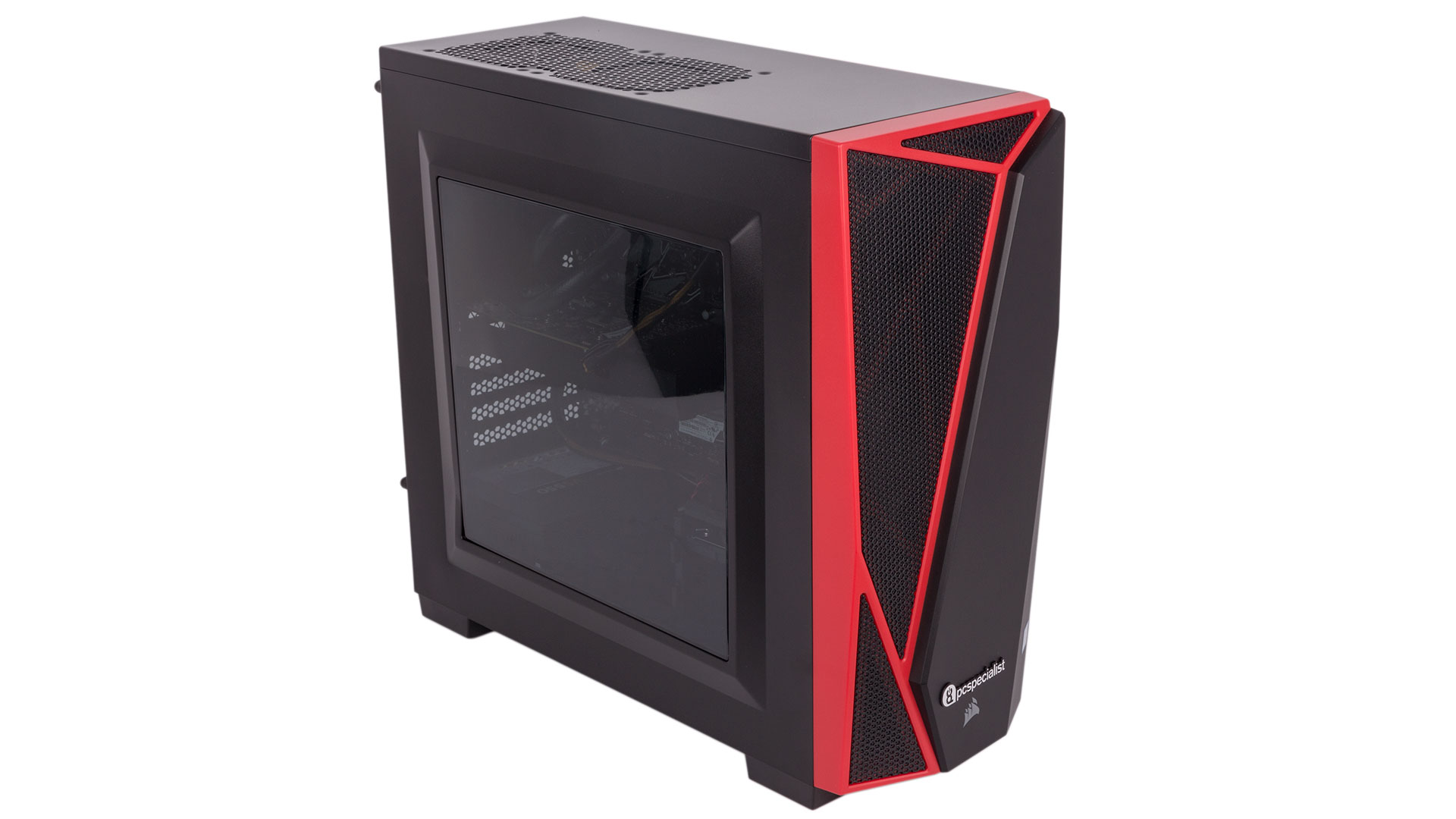 We didn’t get on especially well with the Corsair Spec-04 chassis in our review, and we think PC Specialist could have done better here. £1,000 isn’t a huge sum, but it is substantial, and we think it’s deserving of a chassis with a somewhat more premium look and feel. Downsides of note include the poorly placed I/O panel on the right (the other side to the window), the lack of a roof dust filter, and only having one front USB 3.0 port.