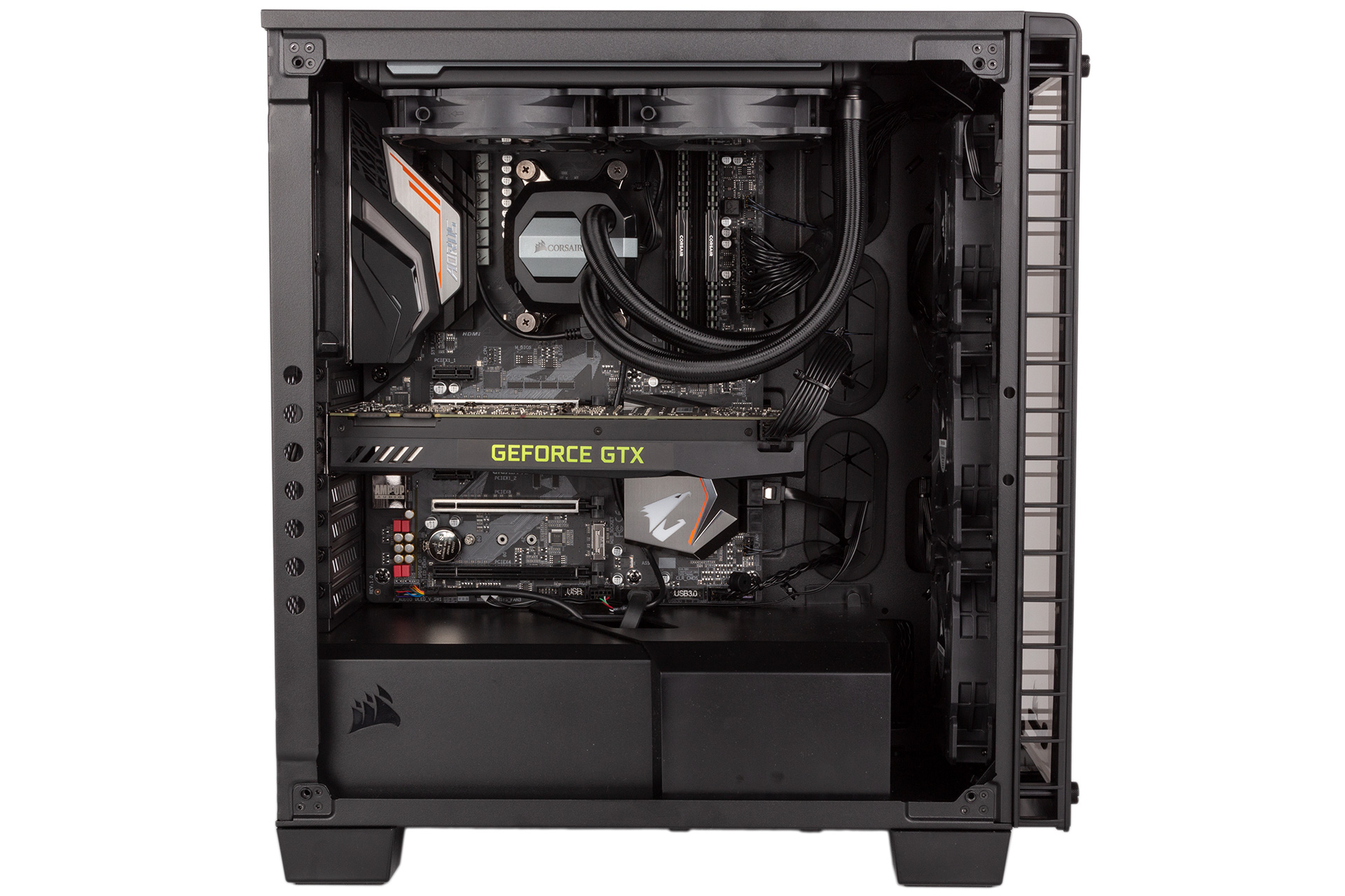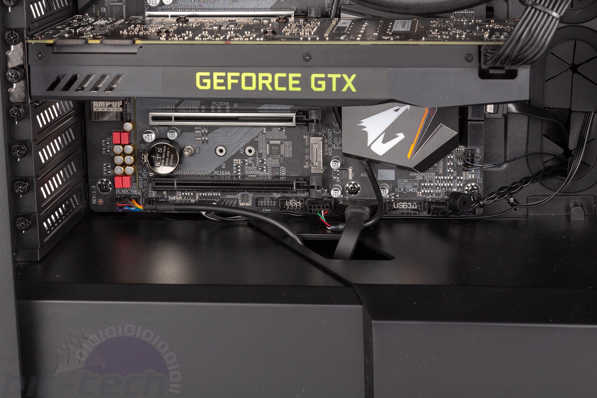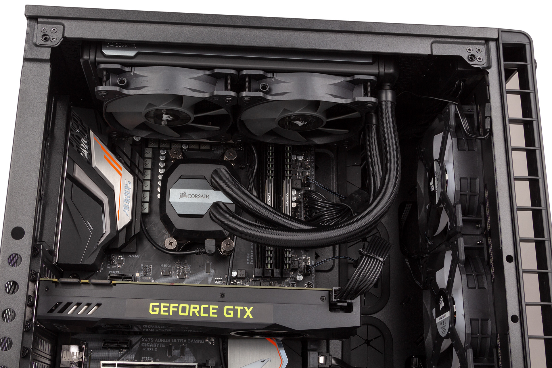 One final RGB-equipped component is the CPU cooler, the trusty Corsair H100i V2 all-in-one with its illuminated pump logo. It has a 240mm radiator cooled by dual 120mm exhaust fans that neatly complemented the trio of intakes; the AIO is connected to the CPU fan header while the case fans plug directly onto the motherboard. An internal USB connection allows you to control it with Corsair Link (not installed by default), while Smart Fan 5 from Gigabyte has great features for chassis fan control. We do think the overly thick tubes of the H100i V2 are a bit dominating, but it should do a good job nonetheless, especially as the CPU isn’t overclocked.