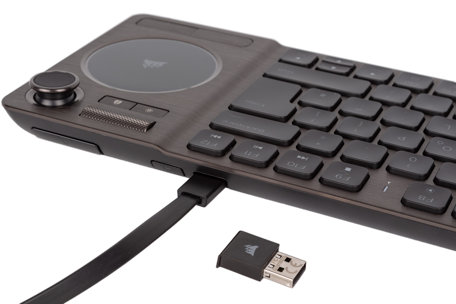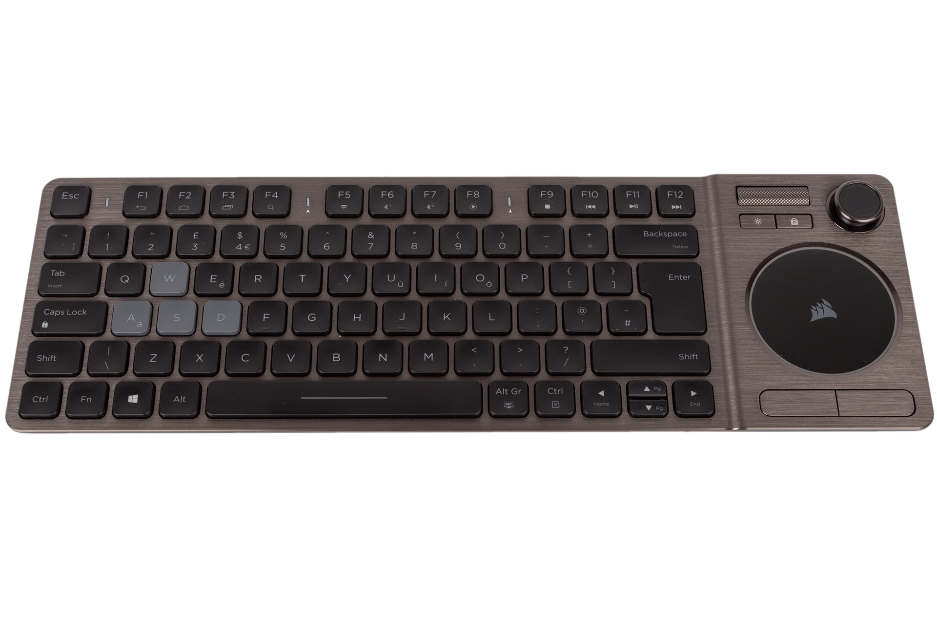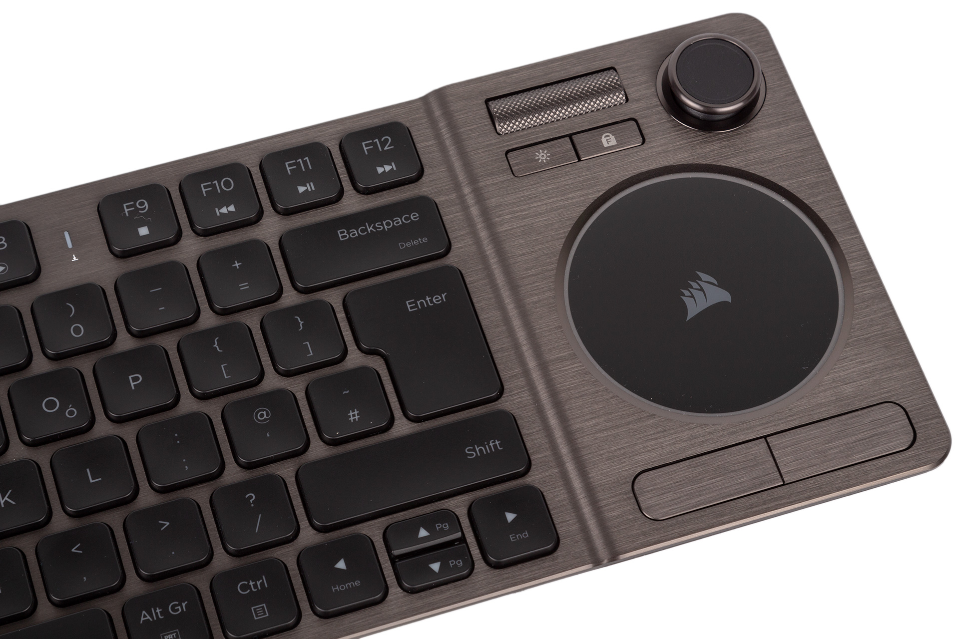 Above the pad you get a metal volume control wheel that Corsair has used successfully before, but this time it also has click-to-mute functionality. Beneath it you have a gaming mode/Windows lock key and a brightness control switch that will cycle between off, 33 percent, and 66 percent brightness. For 100 percent to be included in the cycle, you need to tick a box in the software.