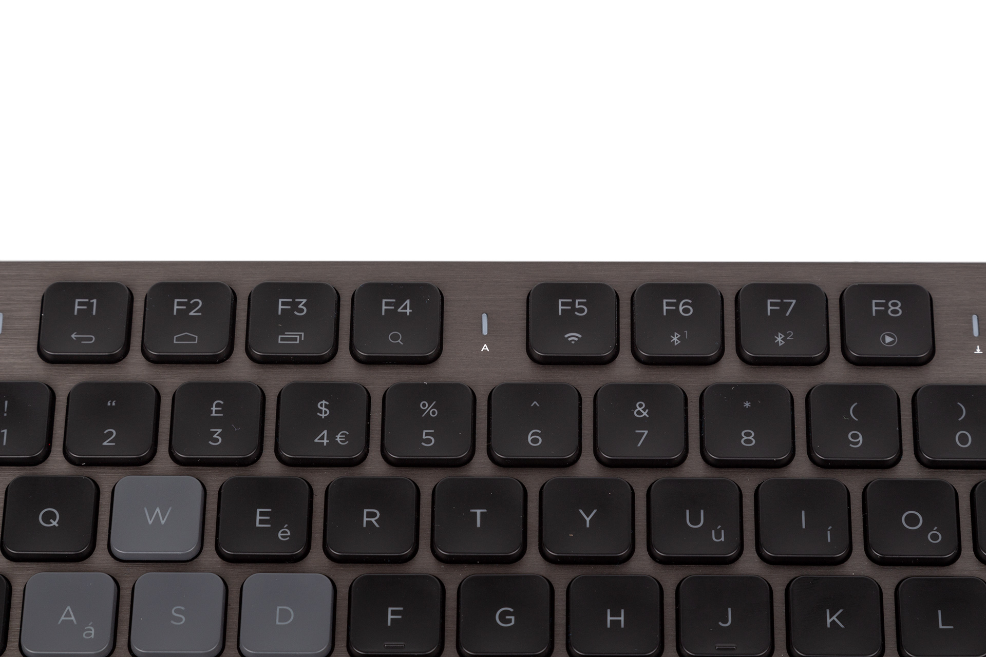 Caps and scroll lock indicator LEDs are found between the F keys, and here you also get a multi-purpose LED primarily for showing the wireless status. It will also show certain battery events, and you can press FN + Enter to get a visual indication of the current battery status.
