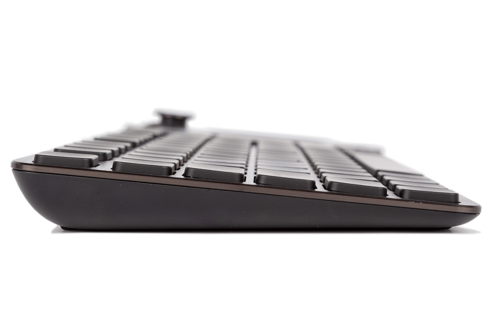Wireless connection is achieved over either 2.4GHz wireless or one of the two Bluetooth 4.2 LE channels, meaning you can have up to three devices paired at once and easily switch between them as necessary. The 2.4GHz wireless relies on a USB dongle but has the benefit of 1,000Hz polling (1ms response time) and 128-bit AES encryption. Over Bluetooth, you can expect a ~7.5ms response time. The range when using 2.4GHz is excellent – you’re more likely to stop being able to see what’s on screen before the keyboard loses range.