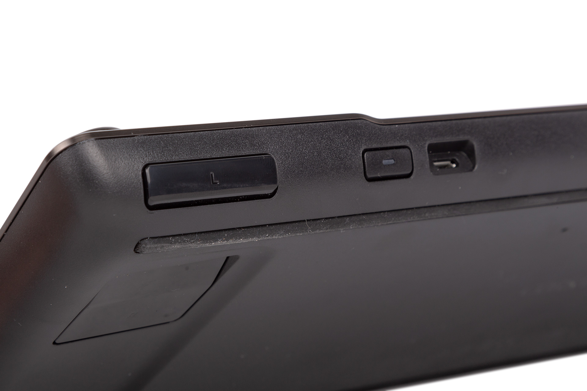 The micro-USB charging port is located on the back next to the power button. Corsair reckons the 2,070mAh Lithium-Ion battery is good for up to 40 hours of continuous use, but with light use (i.e. ~30 mins/day) it says one or two months is a better estimation. Backlight brightness level will be a big factor in battery life.