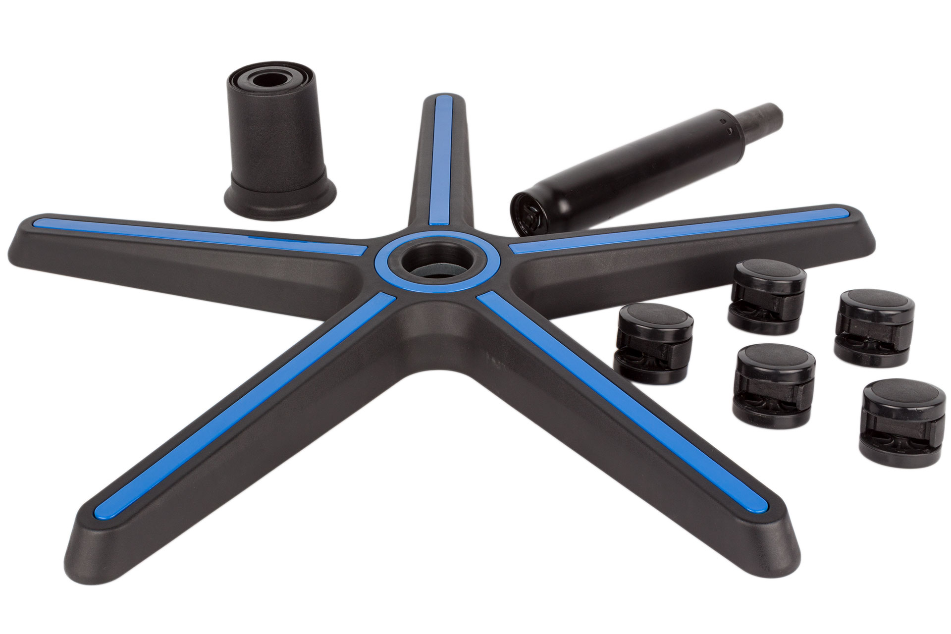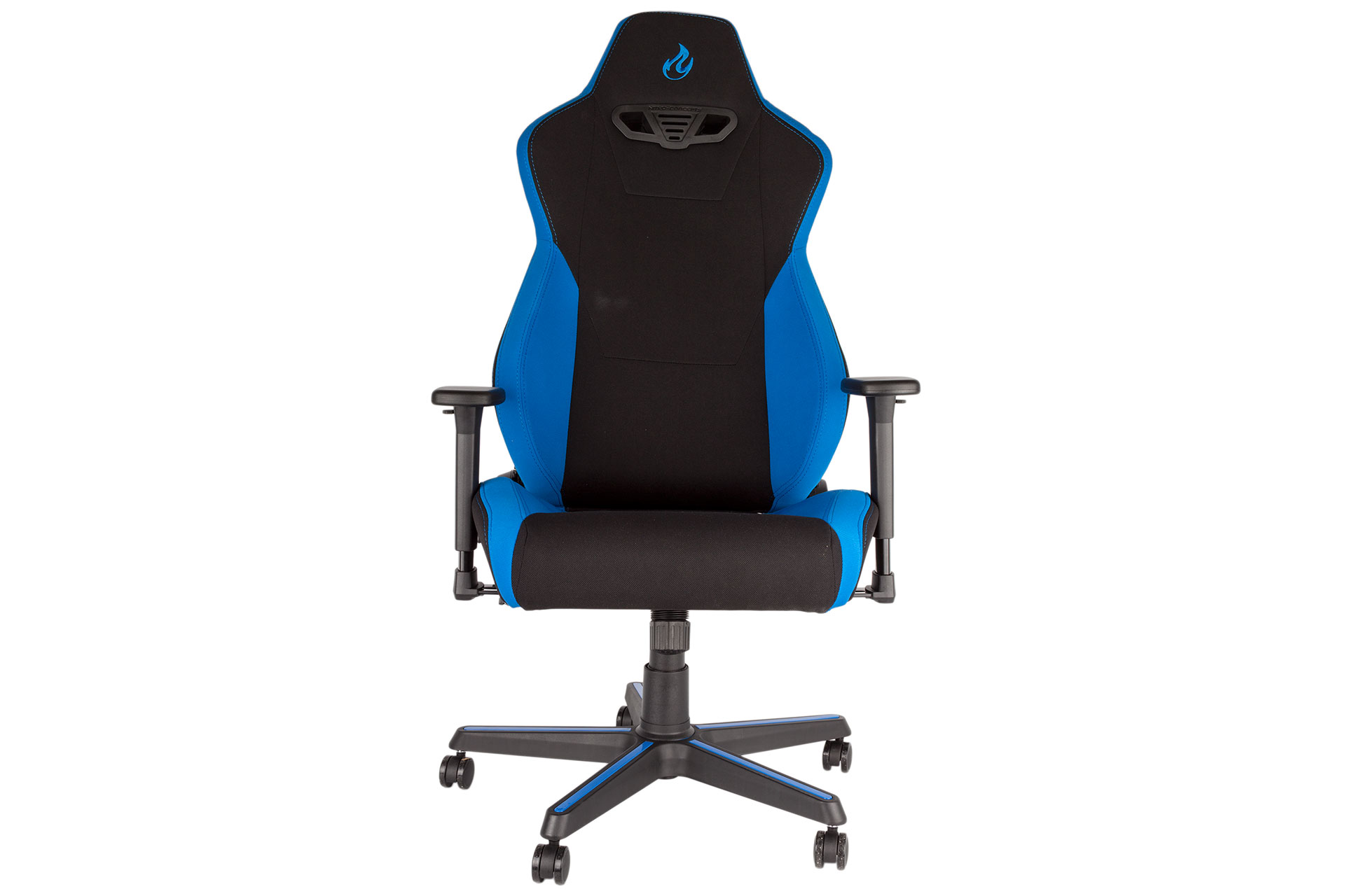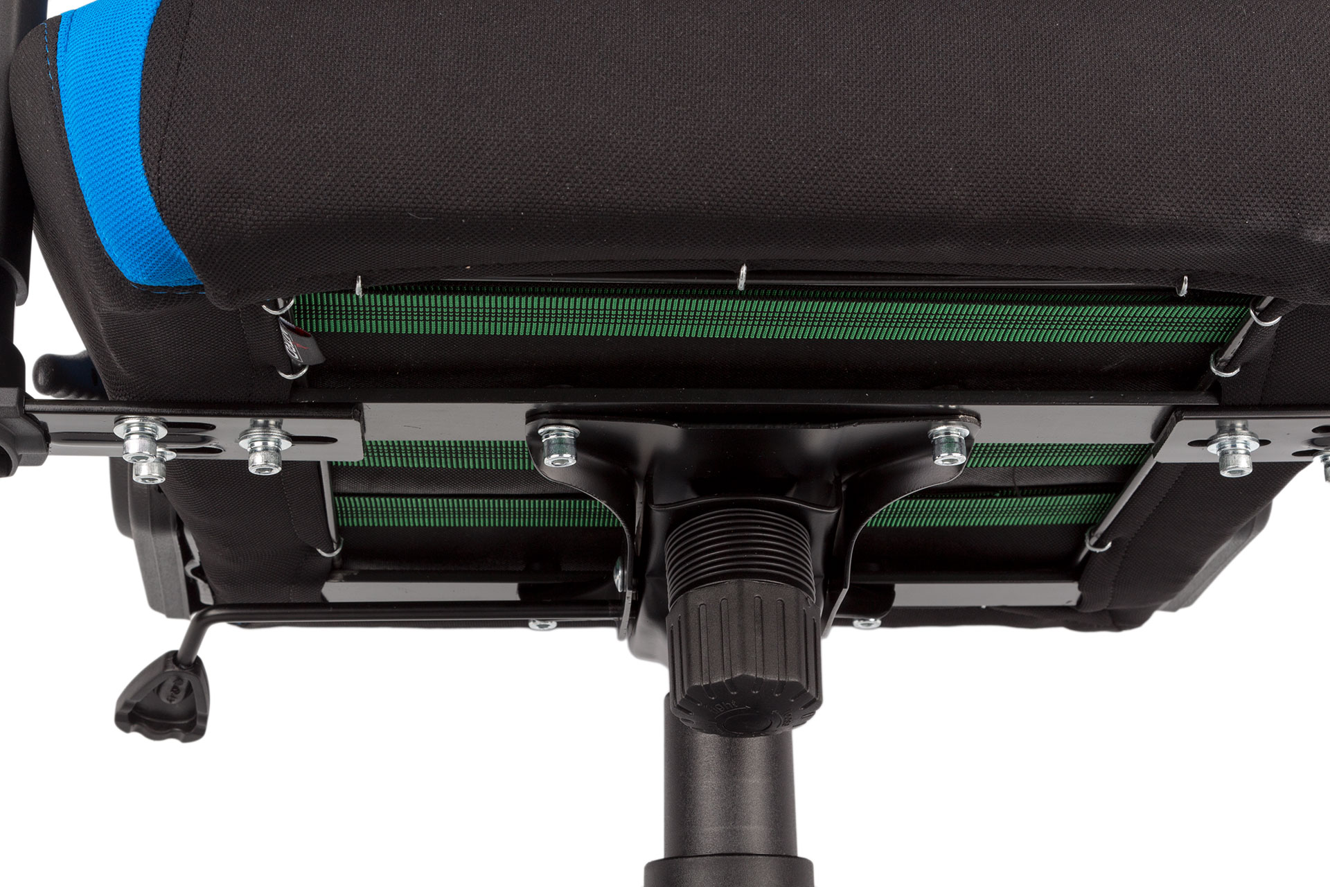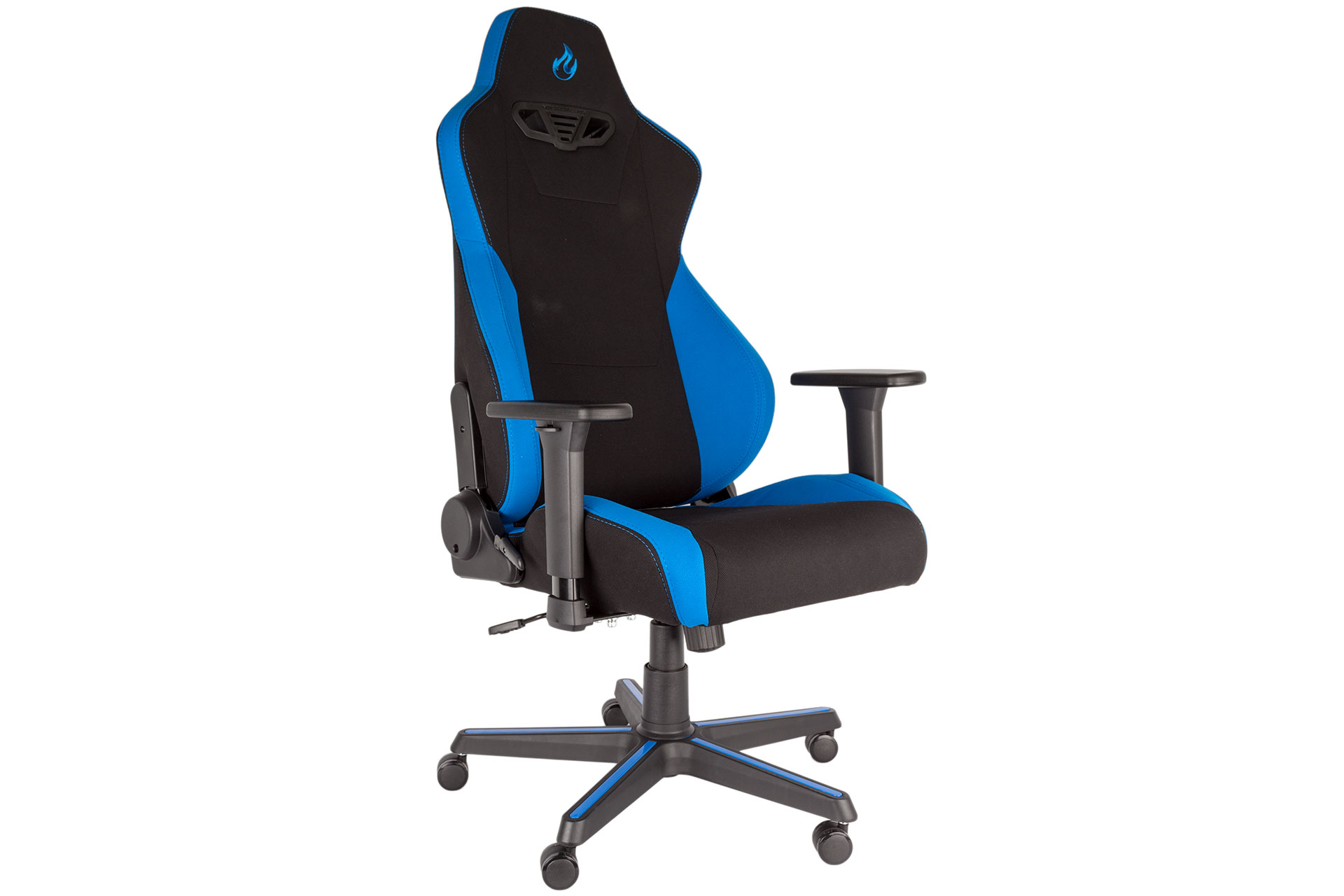 The build process is mostly identical to most other models that look like this too. The wheel base is plastic with blue highlights – not metal, unfortunately – and into this the five 50mm casters are slotted. The Class 4 gas lift, which supports up to 135kg load, slots into the centre and is then covered with stacked plastic “cups” that form a cover. The height and tilt adjustment mechanism screws into the underside of the seat base, to which the armrests come pre-mounted, and this is then lowered onto the lift. The final and most fiddly step is aligning and securing the backrest to the recline mechanism that emerges from the seat. It's not overly challenging, requiring only eight bolts in total to be fastened, and the necessary Allen key is of course supplied.