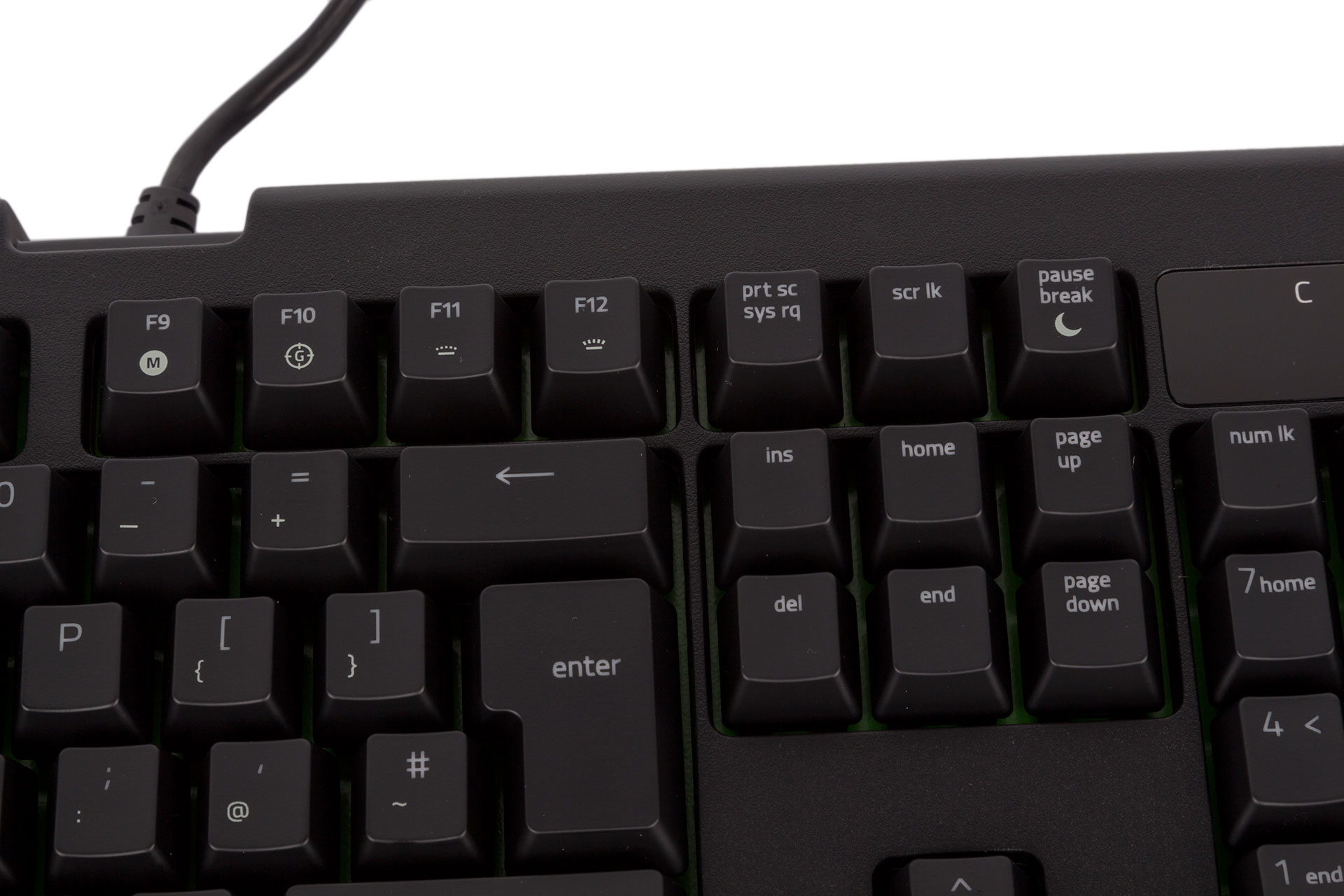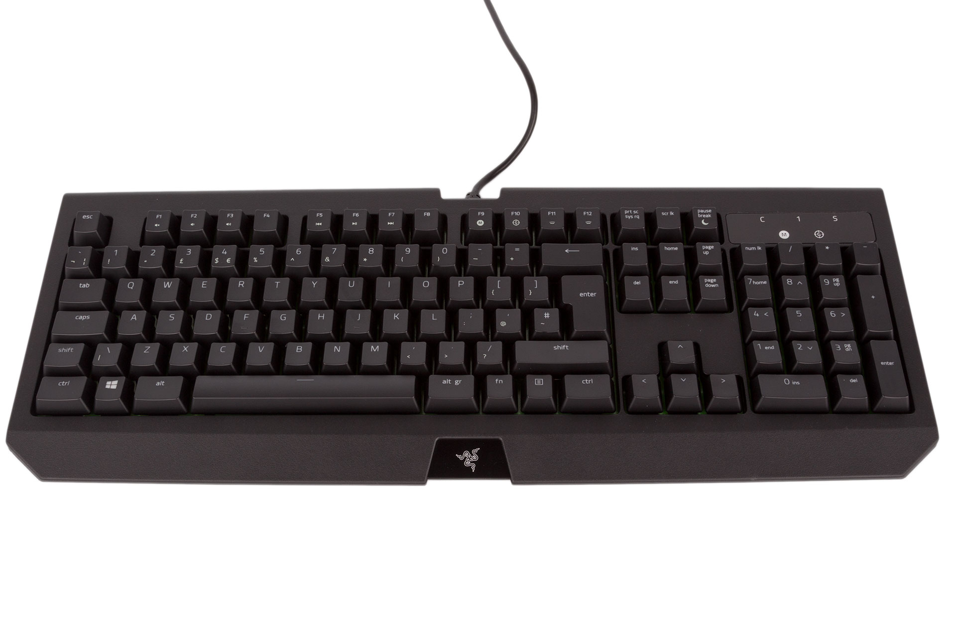 The glossy plastic section in the top right has the lock indicators, the gaming mode indicator, and the on-the-fly macro symbol, all of which light up green except the latter, which is red (only when in use). The three-headed snake logo beneath the bottom row of keys also gets its own green LED.