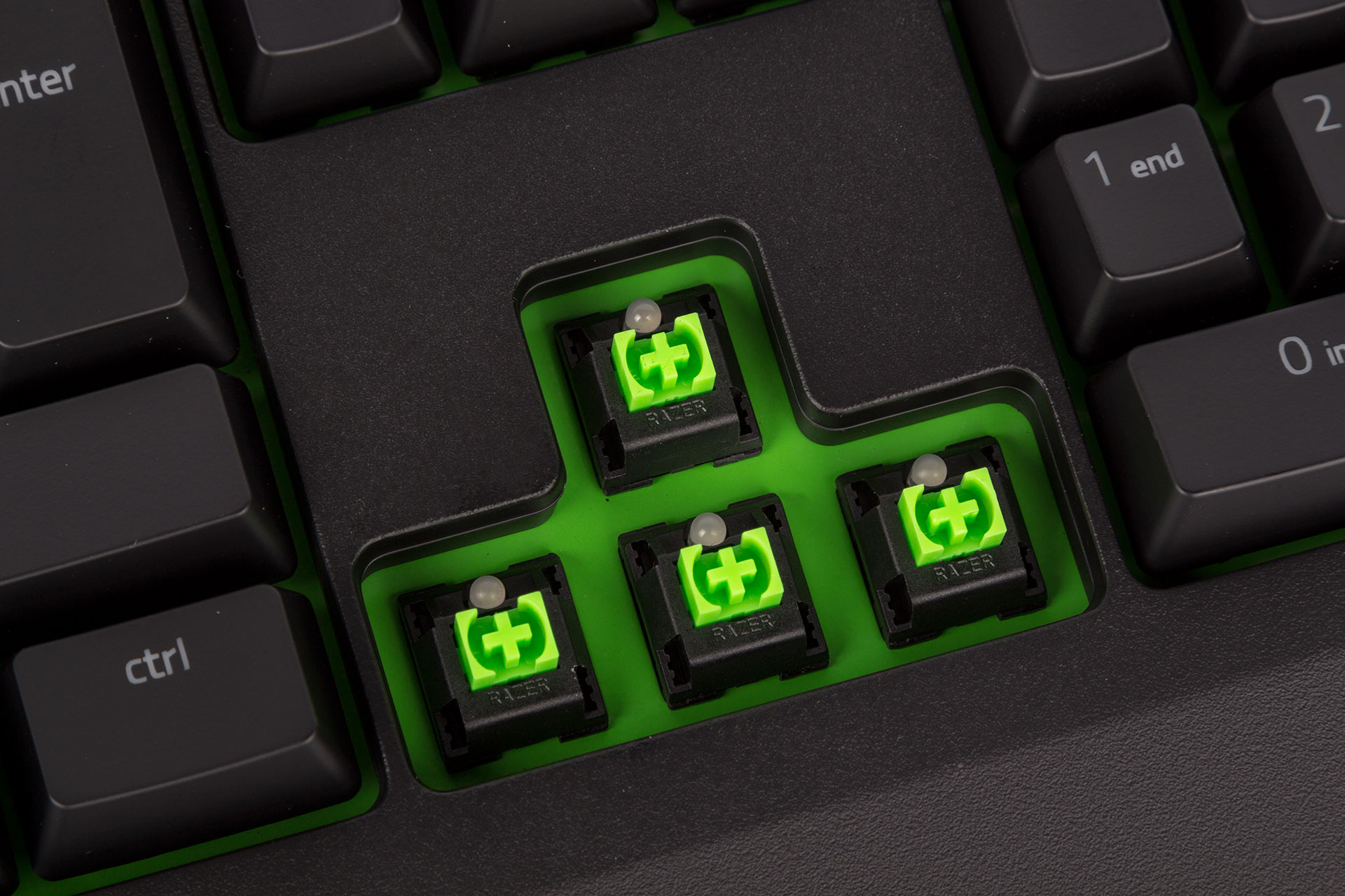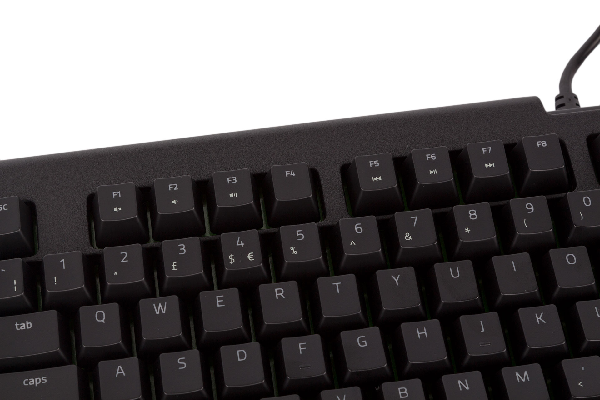 Each switch includes a green LED at the top, which shines through the top part of the keycaps. Razer ensures that the main symbols are top-etched to ensure that as much light as possible gets through. However, all secondary/lower symbols are printed rather than etched, so they don't light up. This avoids having uneven lighting, but it does potentially make the keyboard a little harder to use in the dark. Still, with the vivid green LEDs complemented by the green midplate, the lighting quality is excellent.