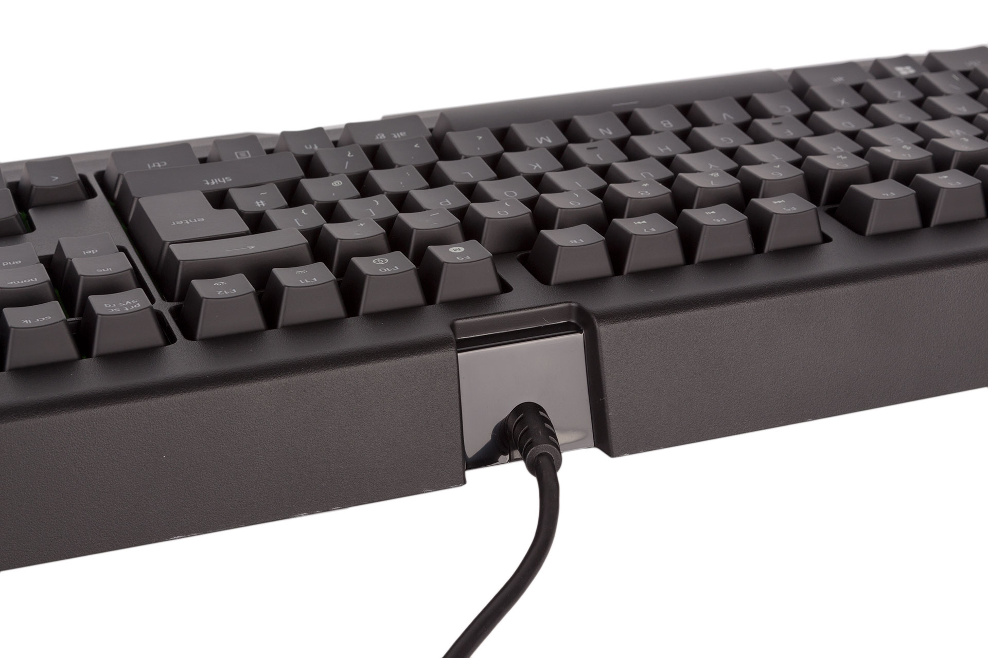 Razer doesn't actually detail how it makes the BlackWidow Ultimate water-resistant other than saying that it has modified the switch design. There is no protective rubber membrane like there is on the Corsair keyboard, so we can only assume it has achieved a tight seal around the switches. The switches poke through a flat, green plate that slopes downwards, and there do appear to be some drainage holes at the front on the underside too, so this should help with getting water out quickly too.