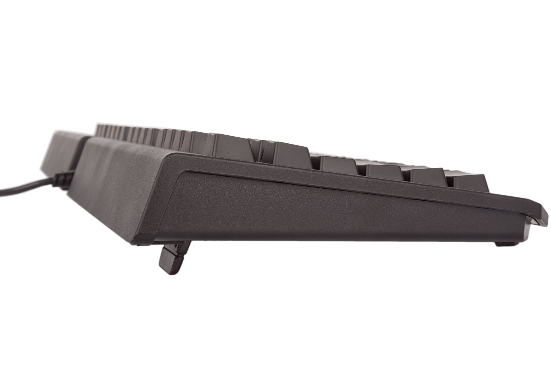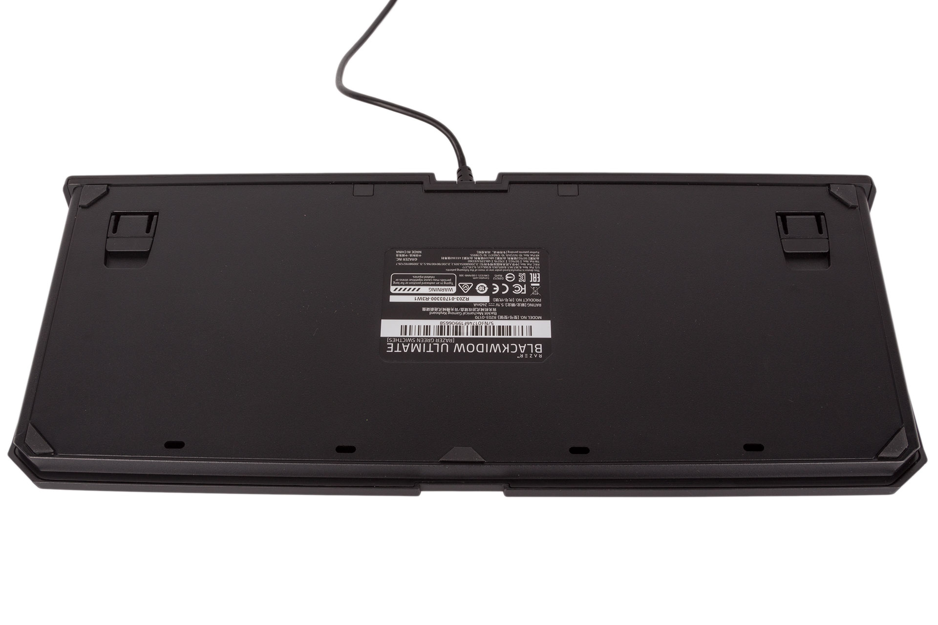 The build quality is decent here. The matt, slightly textured black plastic shell makes for a strong outer layer, and the BlackWidow Ultimate is resistant to flexing, although Corsair's K68 RGB has it beat in this domain. The rubber cable is securely attached at the back, and you also get rubber on the underside, including on the tips of the rear legs.