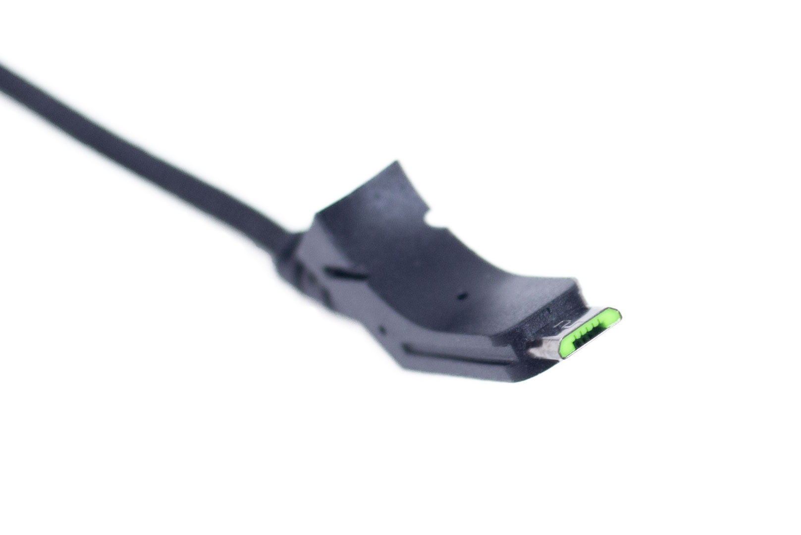This is one of the things that's a little bit short-sighted with the Razer Lancehead. This 2.1-metre micro-USB cable has a uniquely shaped connector and will only fit this mouse, which means that the mouse can't be charged with anything other than this cable, as no other micro-USB cables will fit. Now, this isn't the only mouse that does this; in fact, the Logitech G900 has its own cable, but you can still use other micro-USB cables with it. People who don't travel with their mice won't mind this at all, but for me, it is rather annoying. It means that every time I travel, I have to crawl under my desk, unplug the cable from my PC, untangle it from all the other cables, and pack it away. Then, when I return, I have to reverse the process. In an ideal world, I would be able to use one of my other micro-USB cables that I have to take with me when I travel instead of relying solely on this "special" cable.
