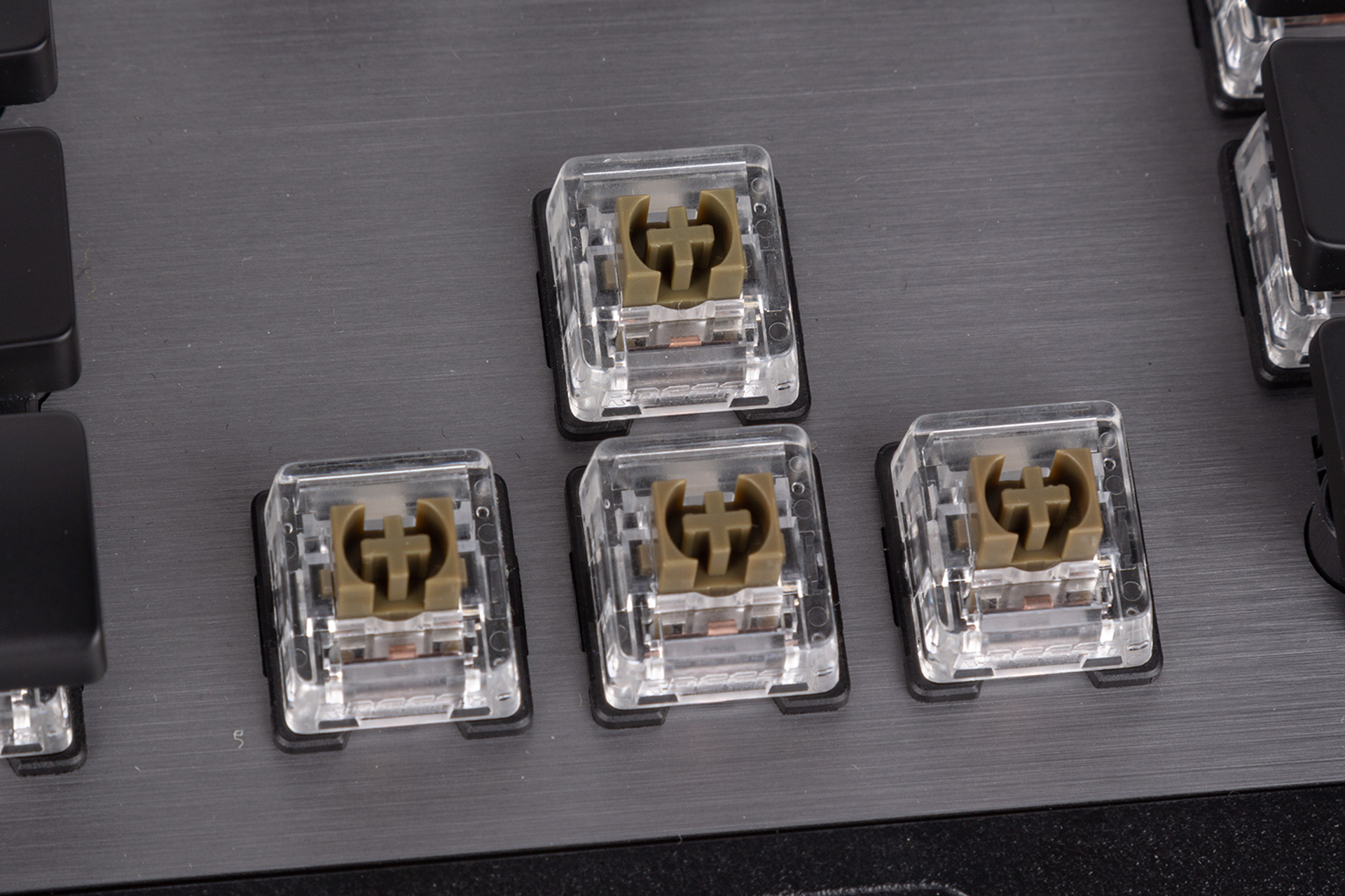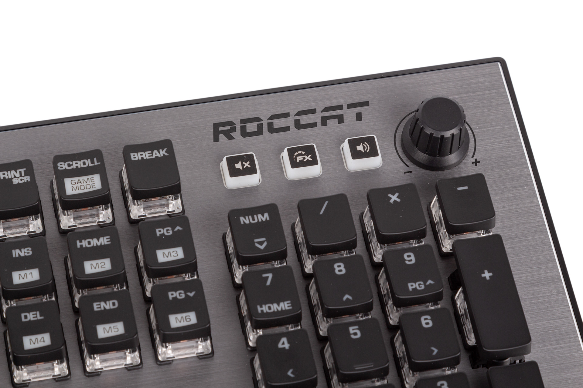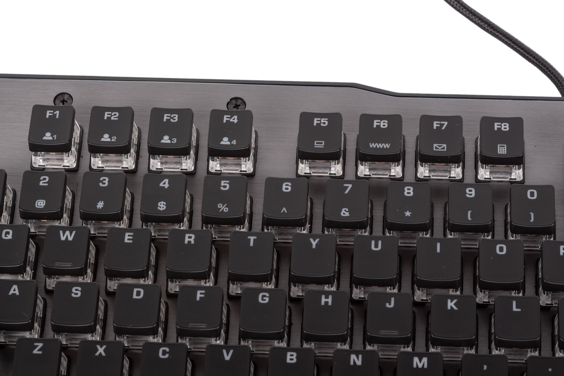 The Titan switches offer tactile, non-clicky feedback with an actuation point of 1.8mm which is halfway through the 3.6mm total travel – 10 percent less than Cherry MX Brown switches on both fronts. The actuation force is 45g, which matches the Cherry MX equivalent. The cross-shaped, military green plunger technically makes them compatible with aftermarket keycaps designed for Cherry MX switches too, but we've been told it's not actually designed for this and non-standard sized keycaps may not play nice. There’s extra stability on these switches as well thanks to additional plastic that completely seals the receiving part of the keycap. The housing is clear, exposing the innards nicely and also ensuring that as much light as possible from the surface-mounted RGB LED is visible. Roccat also claims to have achieved a 20 percent lower switch bounce time (rated at 4ms) than traditional switches, further boosting responsiveness.