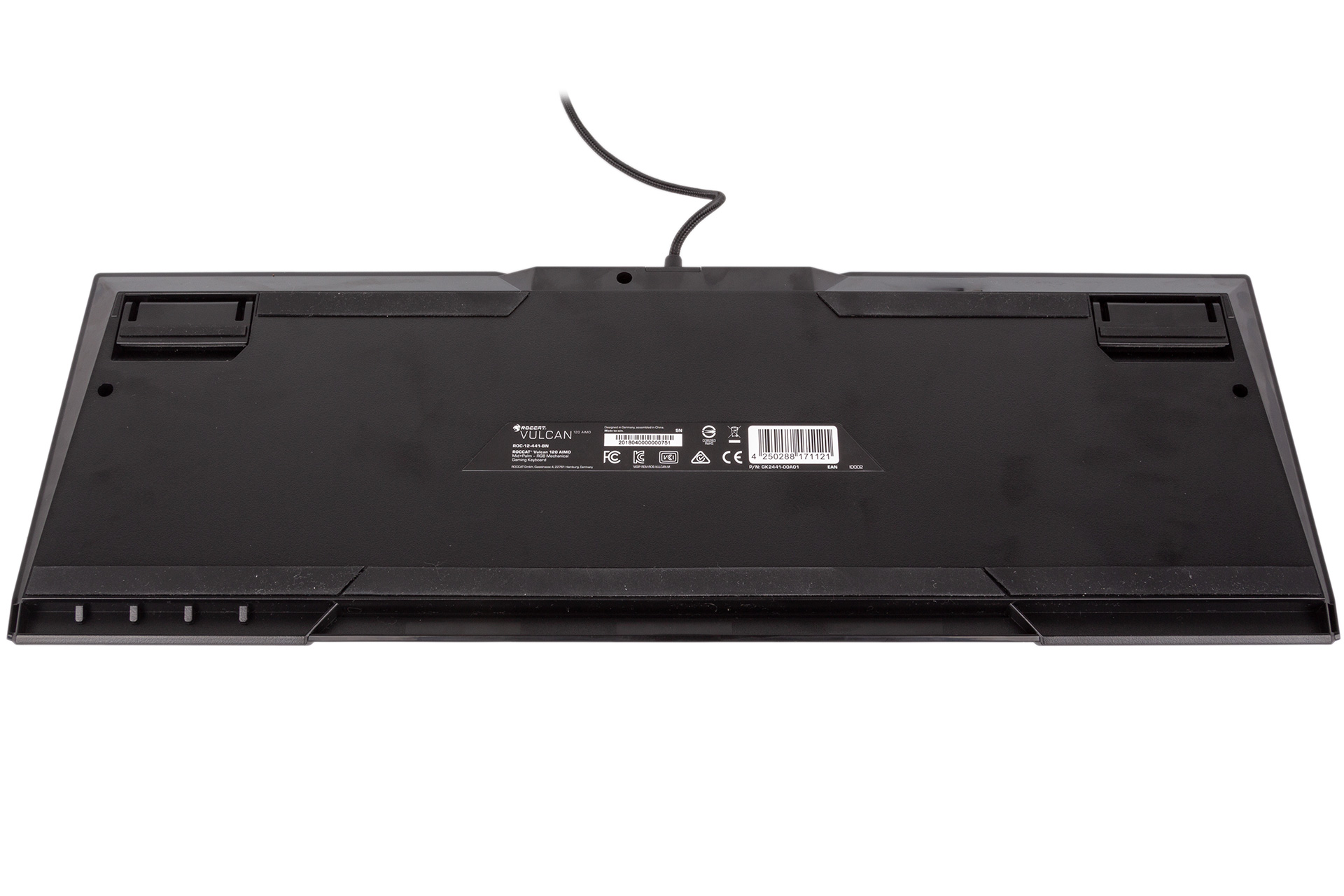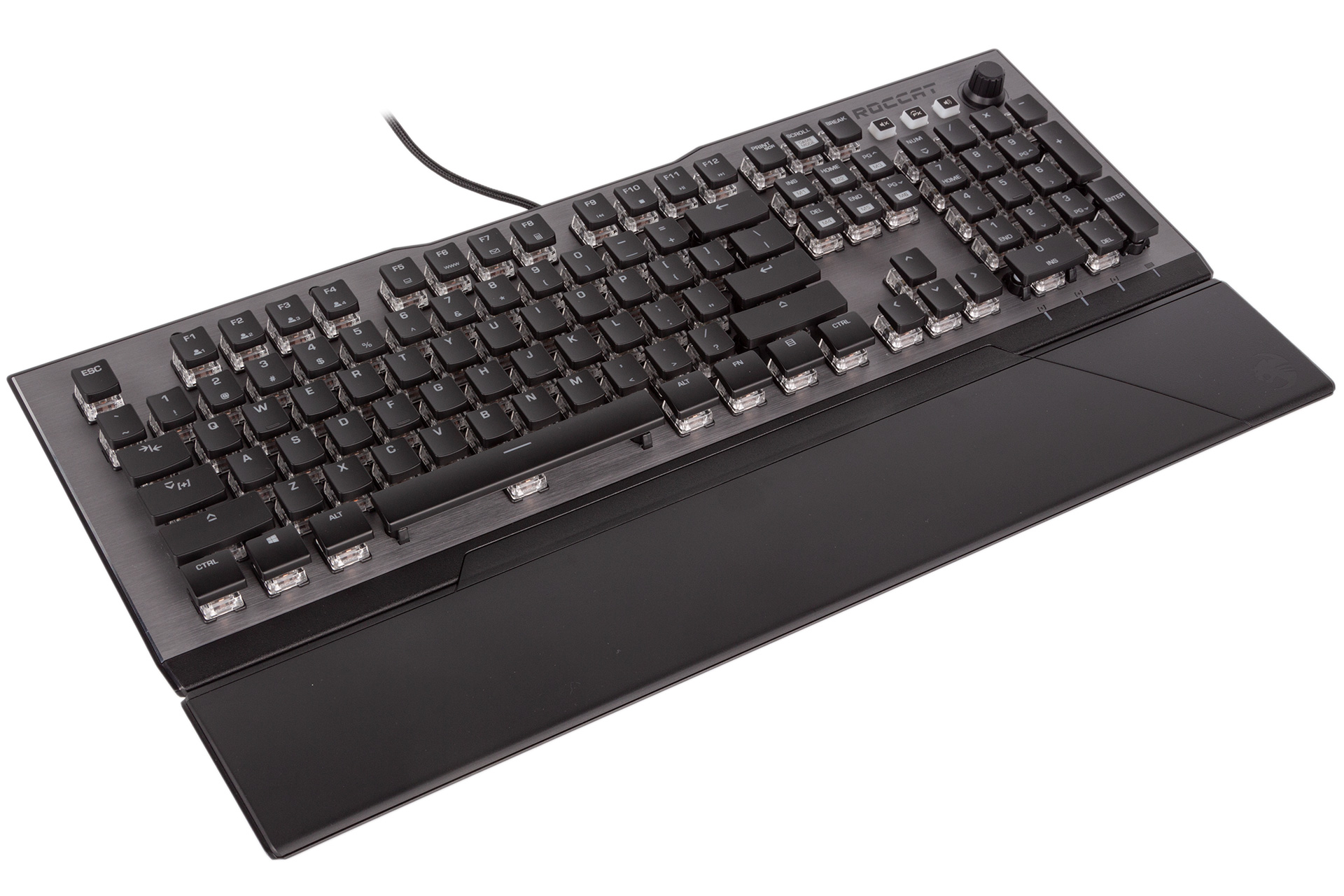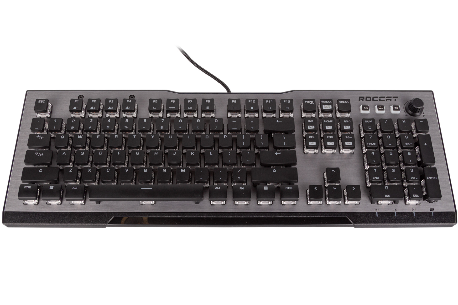First, though, the keyboard itself. The Vulcan 120 has a striking design and one that’s different to previous Roccat models. We rather like it, but of course your mileage may vary. The keycaps are both raised and very shallow, meaning that you get a great view of the switches beneath – it’s rather typewriter-esque. A grey brushed aluminium faceplate adds some sophistication and keeps the keyboard feeling rigid. The plastic underside, meanwhile, is appropriately adorned with rubber to keep grip levels up. The braided cable is non-detachable, and the Vulcan 120 doesn’t offer any pass-through ports.