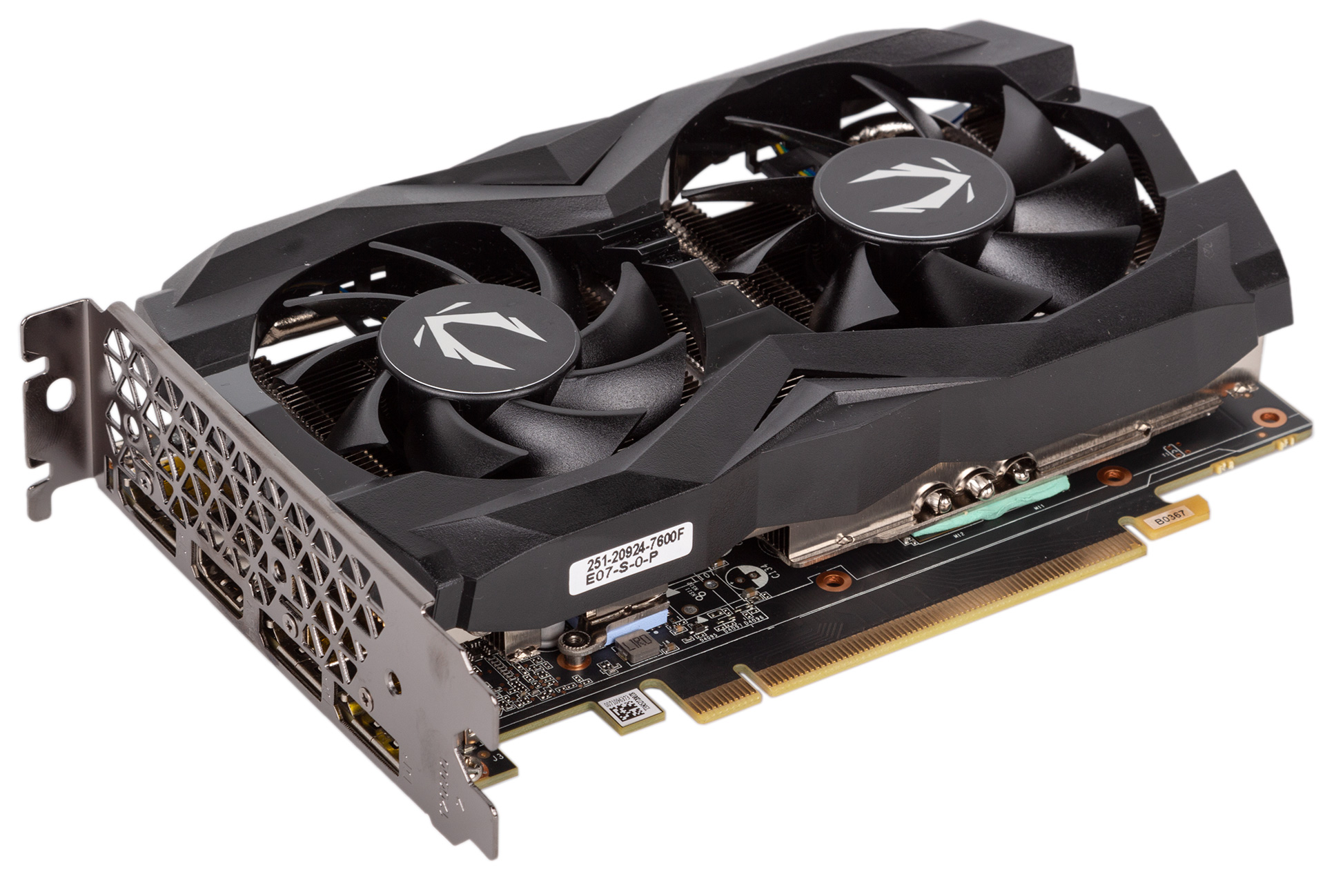 This graphics card is so plain it doesn’t even have a fancy name, although you may see it sold under ‘Twin Fan’ nomenclature. This GTX 1660 Ti is one of two Zotac currently offers, the other being the higher-priced Amp version that features an overclock, backplate, and a slightly bigger cooler. Not so here, however; the Zotac GTX 1660 Ti is stock-clocked with a boost speed of 1,770MHz and GDDR6 memory running at 12Gbps.