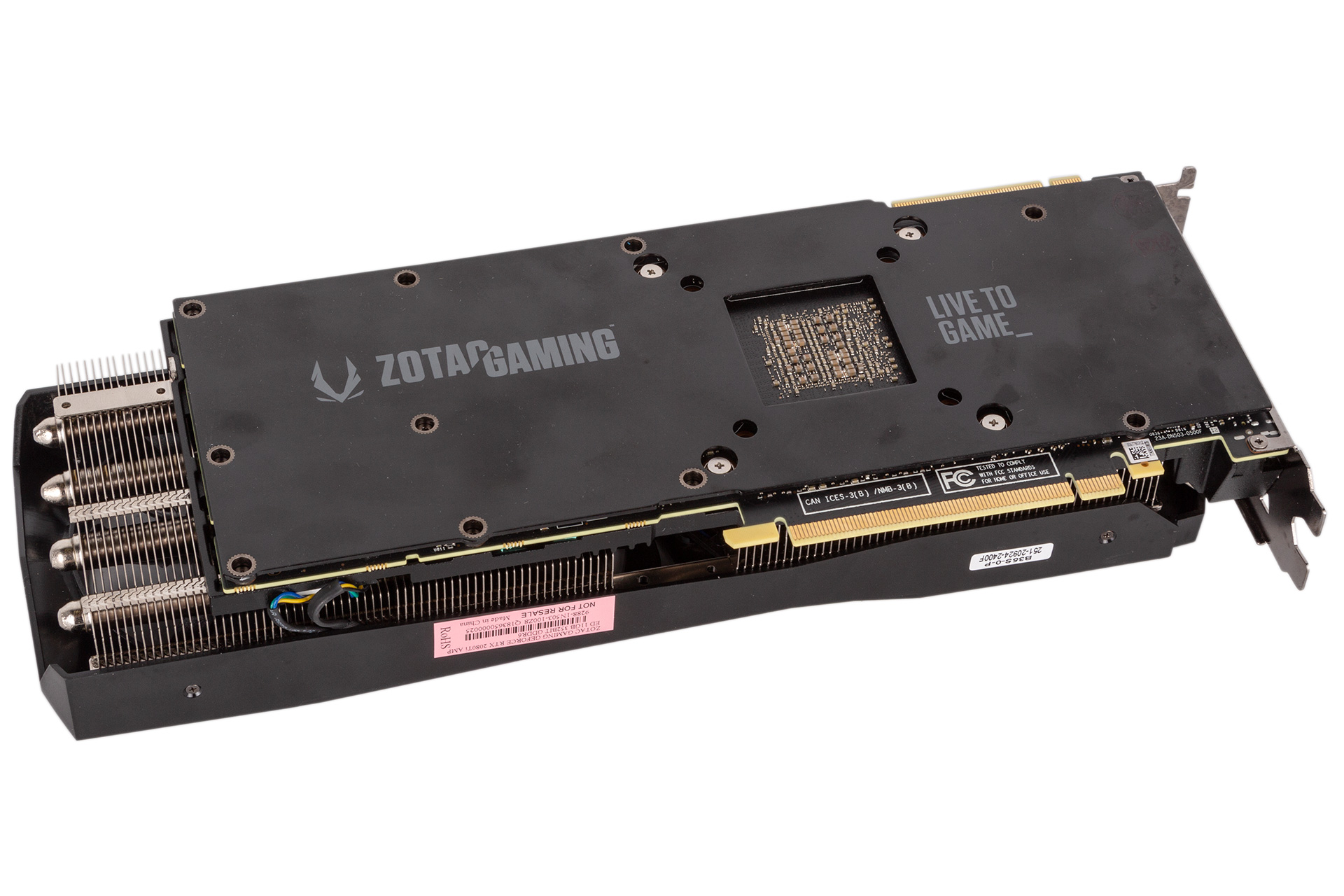Glossy black plastic is rarely a hallmark of quality, yet here it is on a £1,200+ graphics card as part of the plastic shroud. Build quality, therefore, is a step down from the Founders Edition units, although you do at least get a metal backplate. Since the cooler overhangs the PCB quite dramatically, the aesthetic benefit of this is arguably compromised to a degree. On a similar note, Zotac doesn’t supply a cover for the NVLink connector used for SLI. You may also have to contend with a sagging GPU (even in a reinforced PCIe slot), as Zotac doesn’t provide anything to help prop the unit up and maintain delicious straight lines and right angles.
