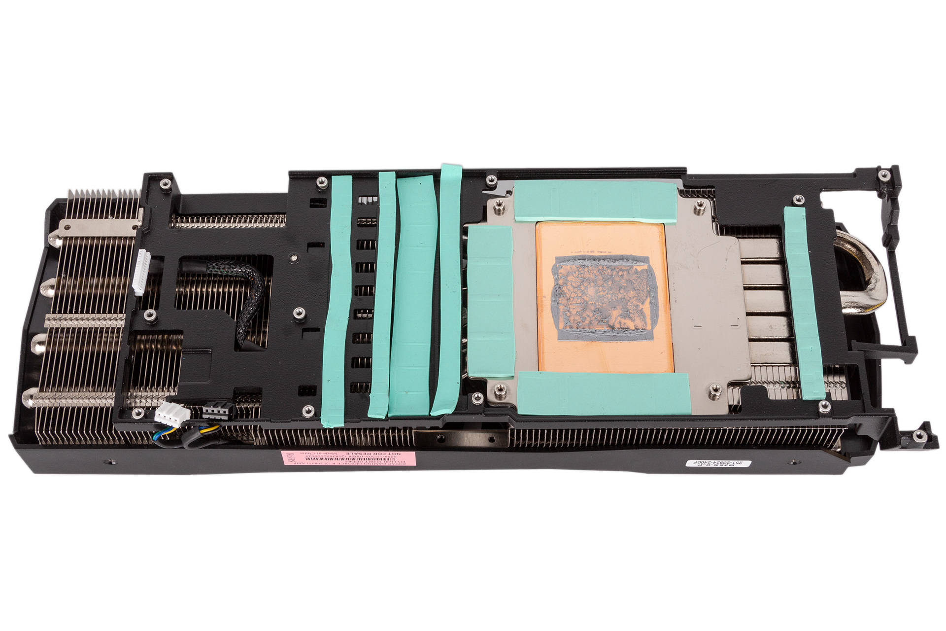 The cooler itself comprises a copper baseplate that feeds five 8mm copper heat pipes with nickel plating, four of which extend straight into the secondary aluminium fin stack. While the card is big, most of that space is actually occupied by metal, so it’s not wasted. Thankfully, a full metal contact plate is also fitted, and this plus a series of thermal pads sees to it that the VRM components and GDDR6 modules are all directly cooled, although there are no thermal pads connecting the backplate to the PCB, so its cooling potential is limited.